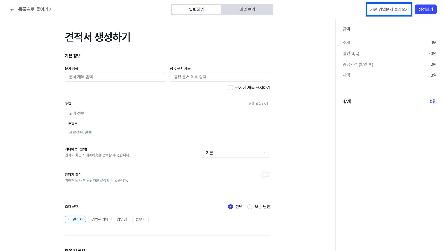 각 영업 문서 페이지의 우측 상단 [생성하기] 버튼을 눌러 새로운 영업 문서를 만들 수 있습니다.
