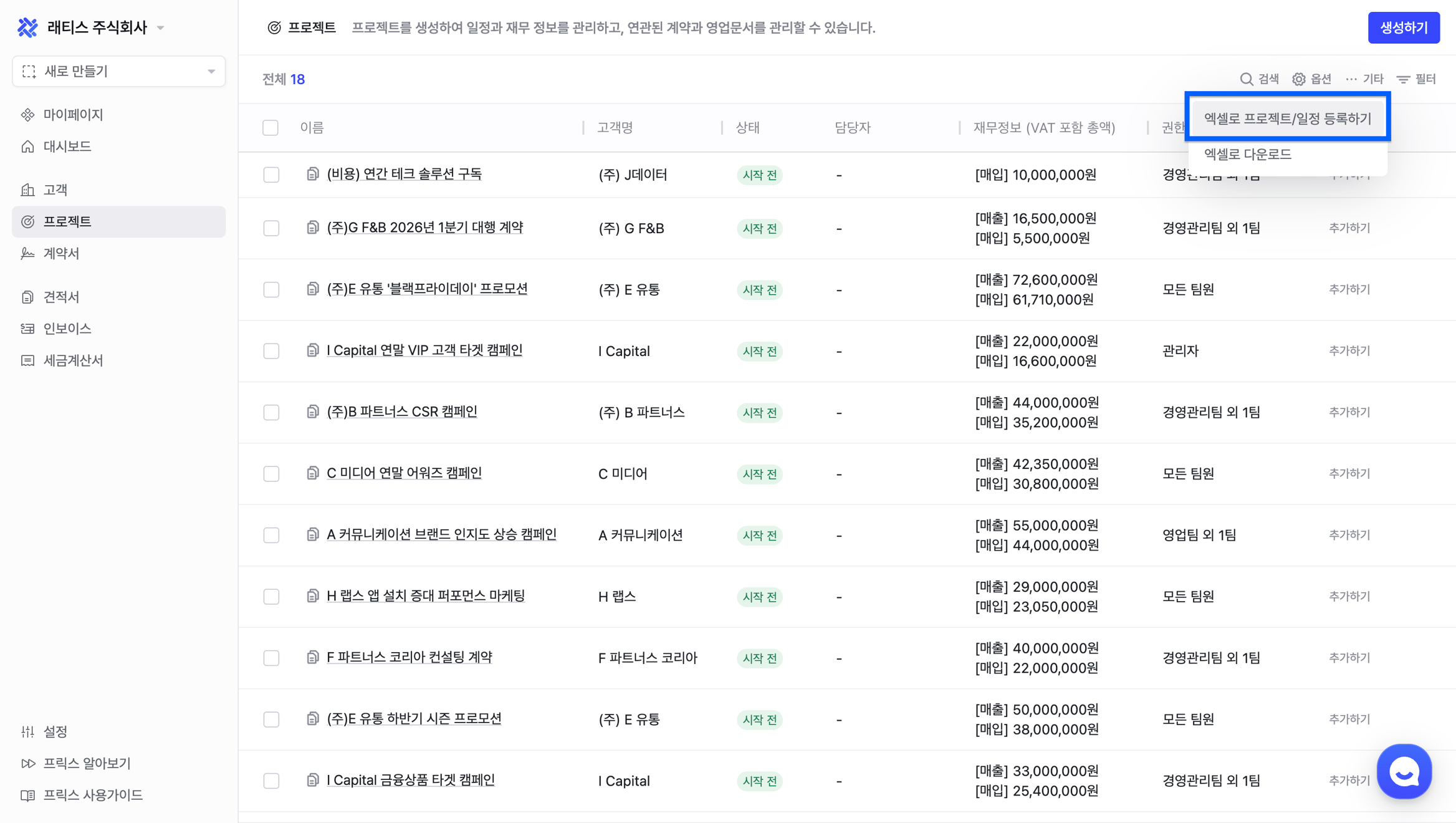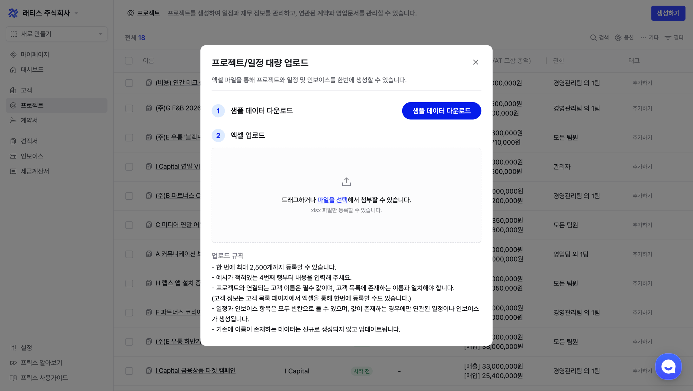 프로젝트와 연결된 인보이스를 엑셀로 업로드하여 대량으로 생성할 수 있습니다.