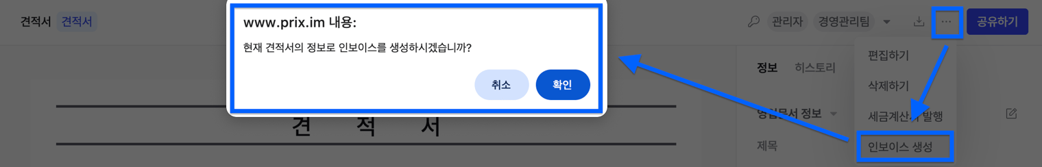 견적서 상세 페이지 우측 상단 옵션 아이콘 > [인보이스 생성]