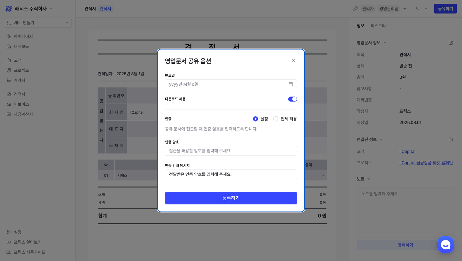 인증 암호: 공유받은 링크에 접속할 때 암호를 입력해야만 영업 문서를 확인할 수 있습니다.