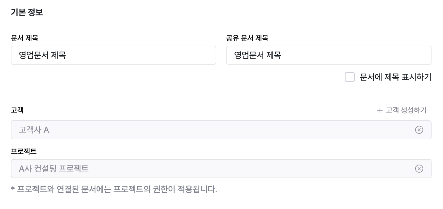 [문서에 제목 표시하기] 옵션을 선택하면 영업문서 본문에 '공유 문서 제목'이 표시됩니다.