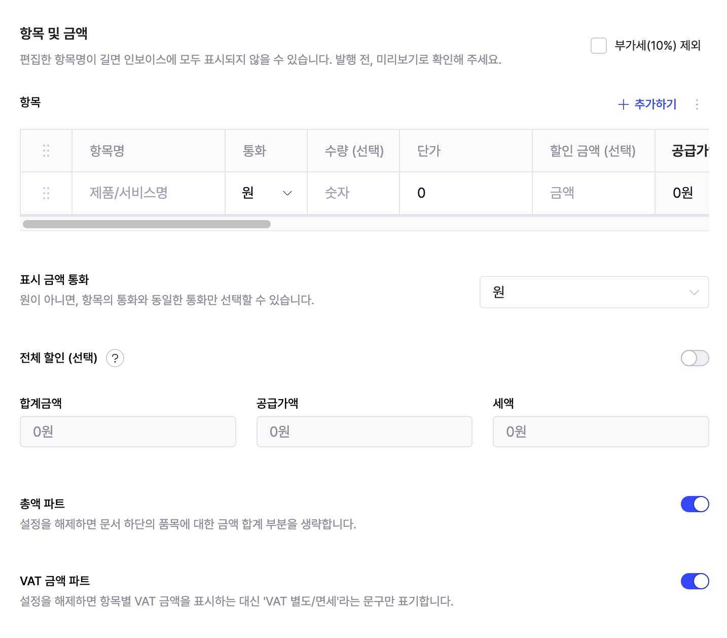 [VAT 금액파트] 옵션을 해제하면 문서에서 세액 항목이 표시되지 않습니다.