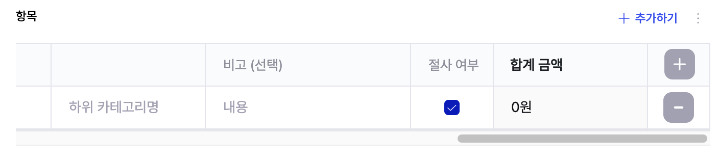 항목 우측 상단 [부가세 10% 제외] 체크박스를 선택하면 세액을 제외한 금액을 입력할 수 있고, 세액은 0으로 나타납니다.