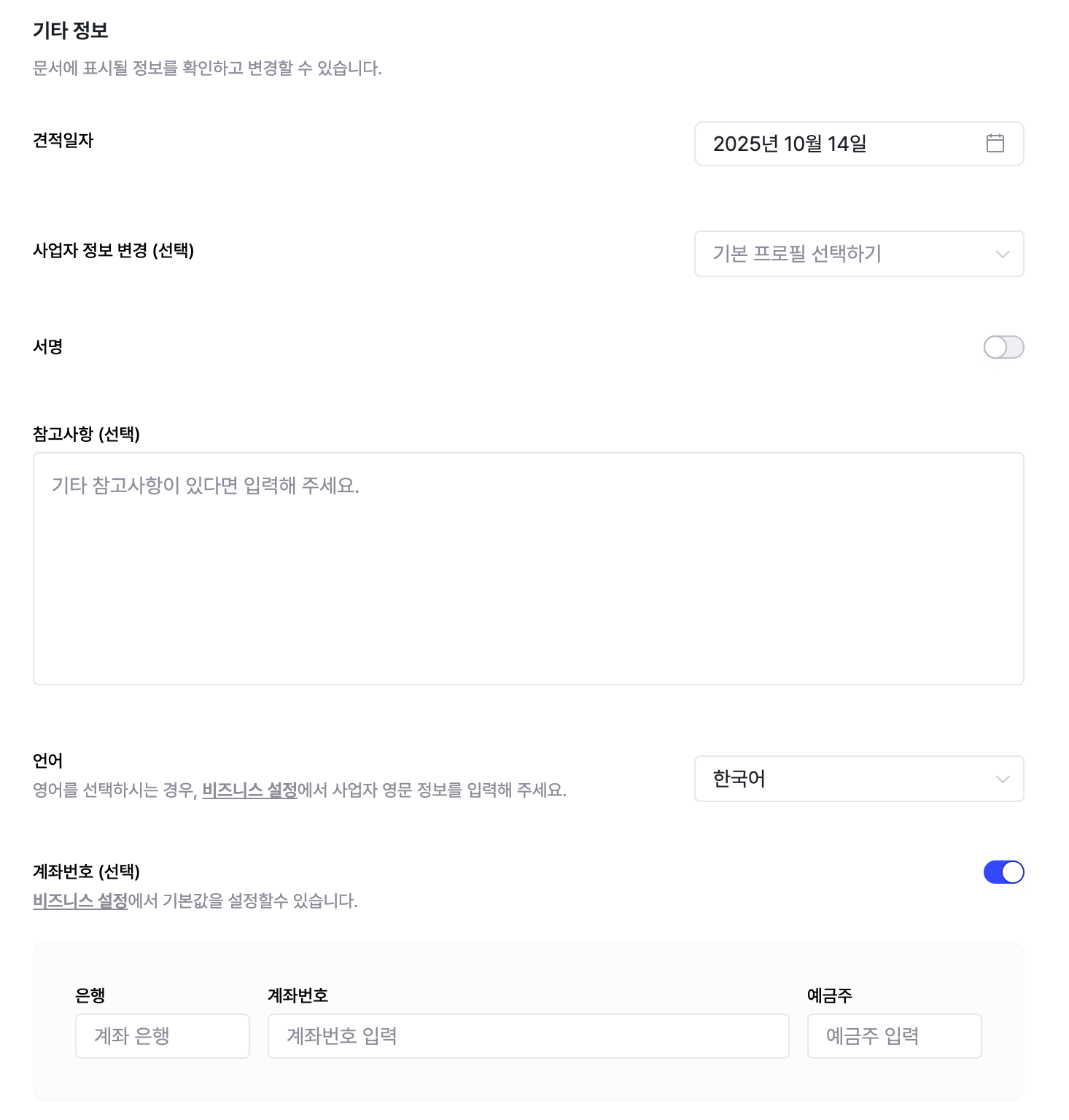 비즈니스 설정에 설정된 기본값을 불러오거나, 직접 입력할 수 있습니다.