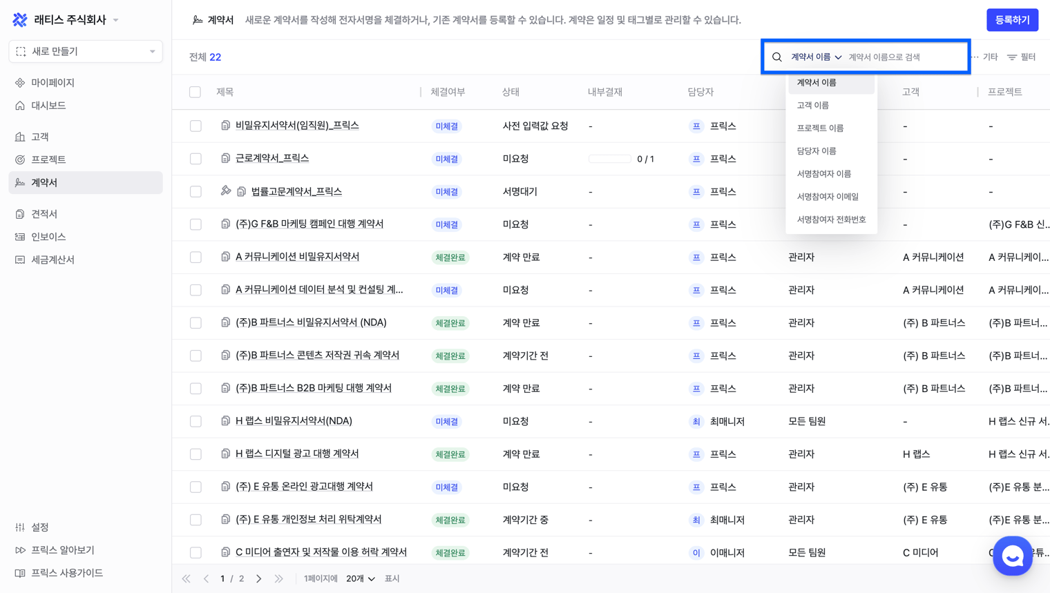 키워드 검색: [계약서] 목록 우측 상단의 검색 아이콘 > 계약서 제목, 고객명, 프로젝트명 등으로 검색