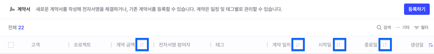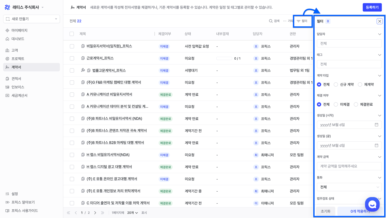 필터링: [계약서] 목록 우측 상단의 필터 아이콘 > 담당자, 태그, 계약서 타입, 체결 여부, 법무검토 상태 등으로 필터링