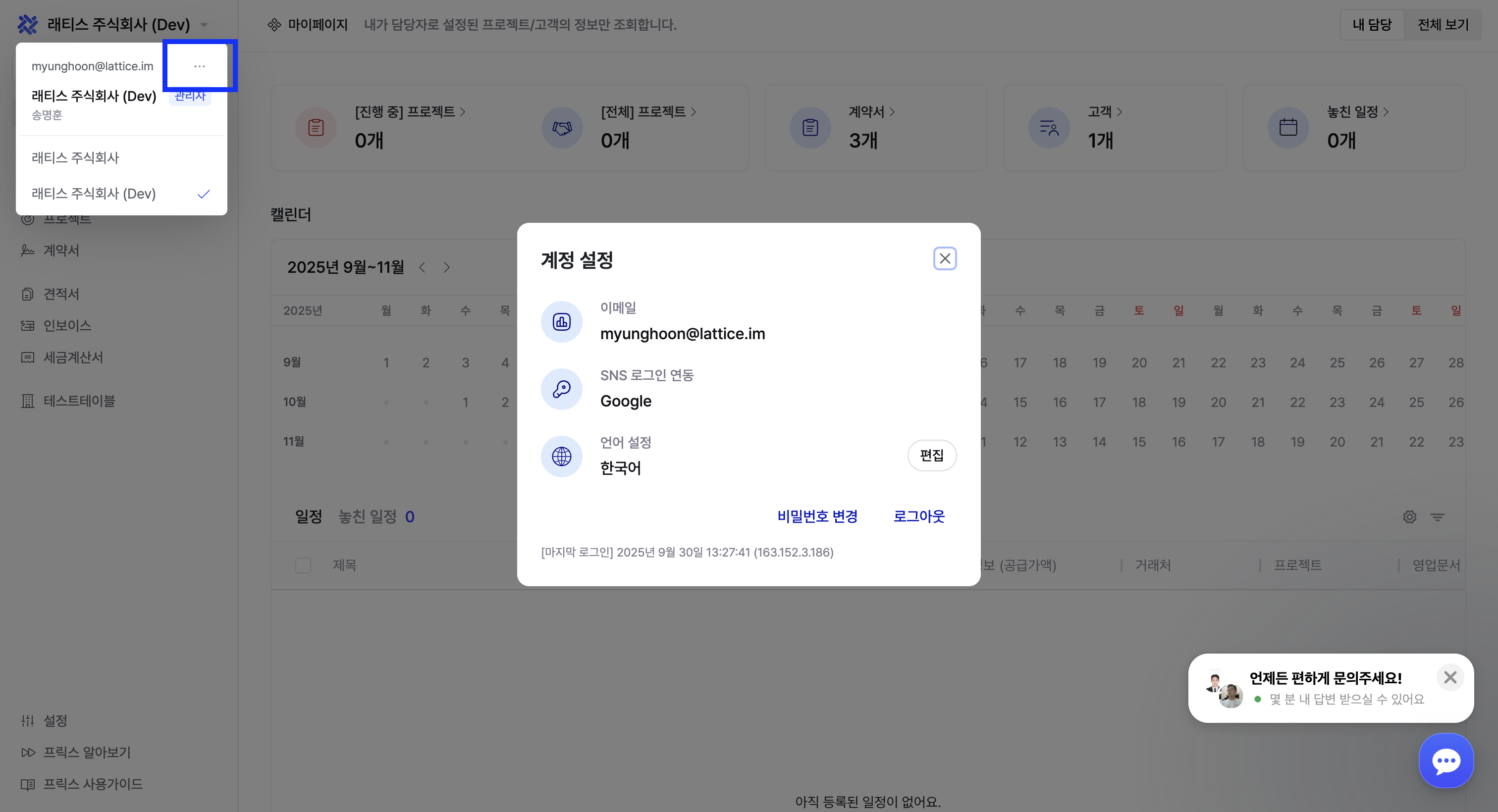 계정에 로그인한 이후에는 [계정 설정] > [비밀번호 변경]을 클릭해 비밀번호를 변경할 수 있습니다.