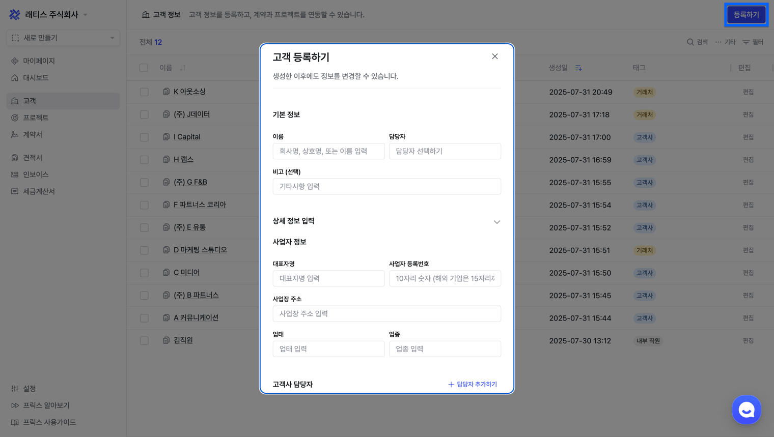 고객 이름, 담당자 및 고객의 사업자 정보 등을 입력할 수 있습니다.