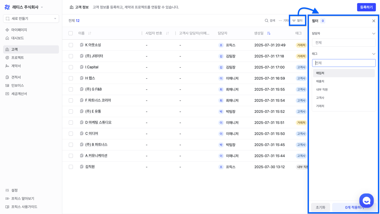 고객명, 내부 담당자, 고객사 담당자 등 키워드로 고객을 검색할 수 있습니다.
