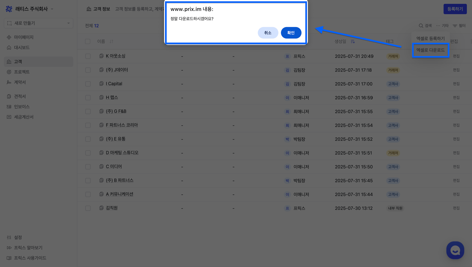 고객] > 우측 상단 [⋯] 아이콘 > [엑셀로 다운로드] 버튼