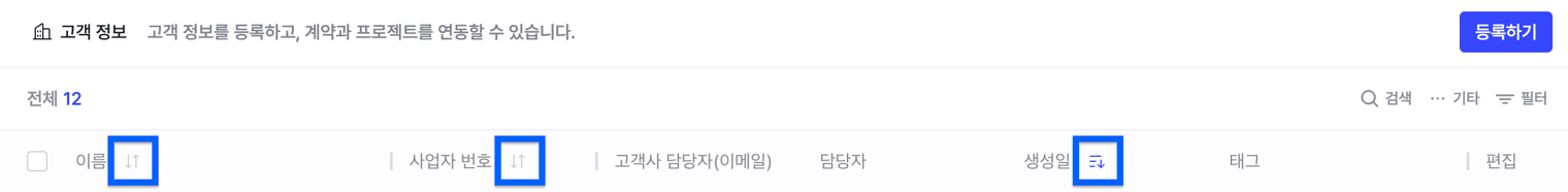 칼럼 우측의 화살표 아이콘을 클릭하면 오름차순/내림차순으로 정렬할 수 있습니다.