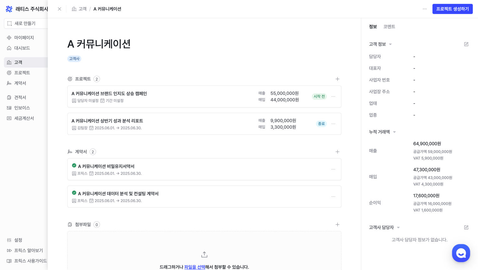 연결된 프로젝트의 청구 데이터를 기반으로 고객 단위 재무 현황을 확인할 수 있습니다.
