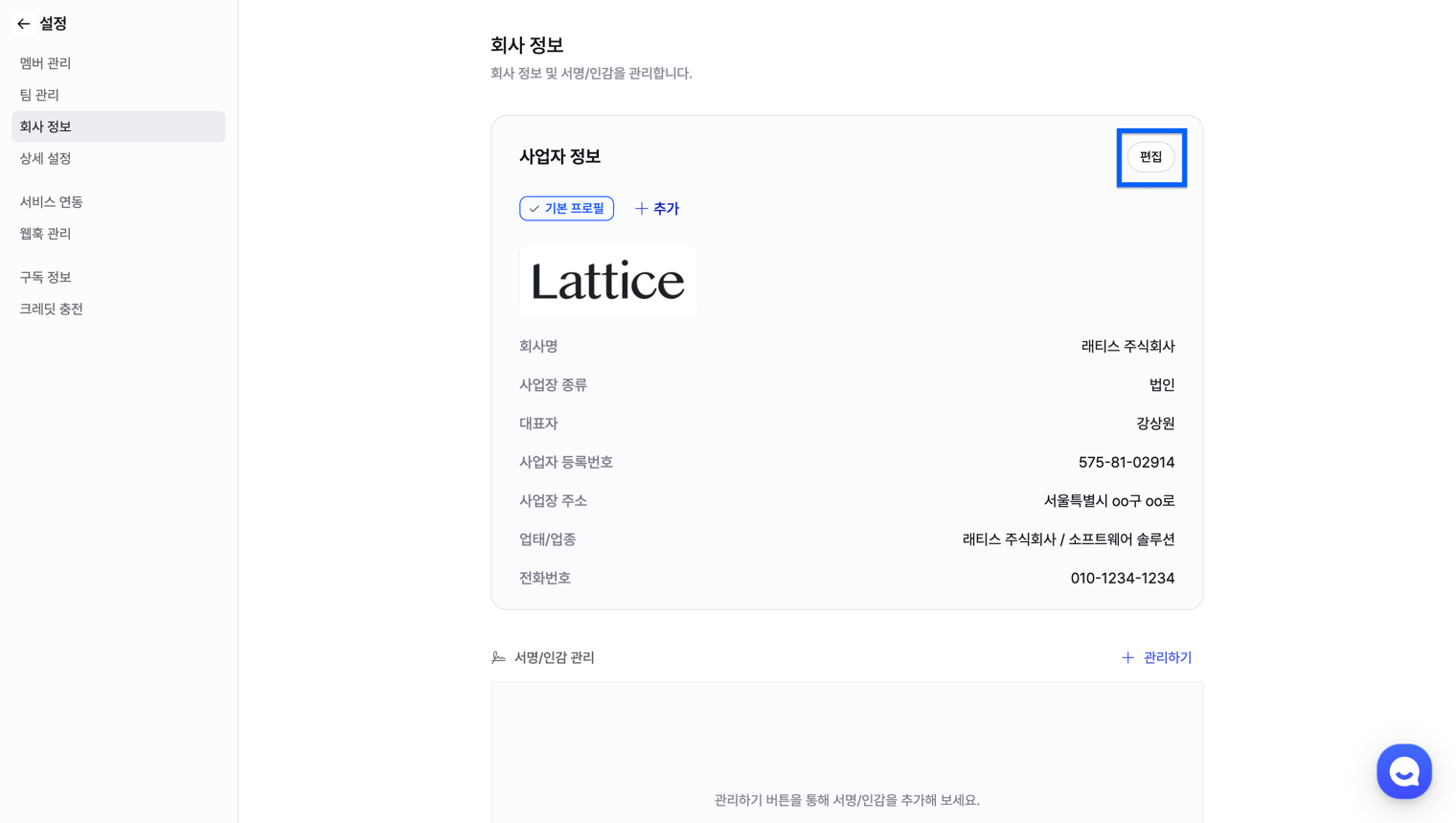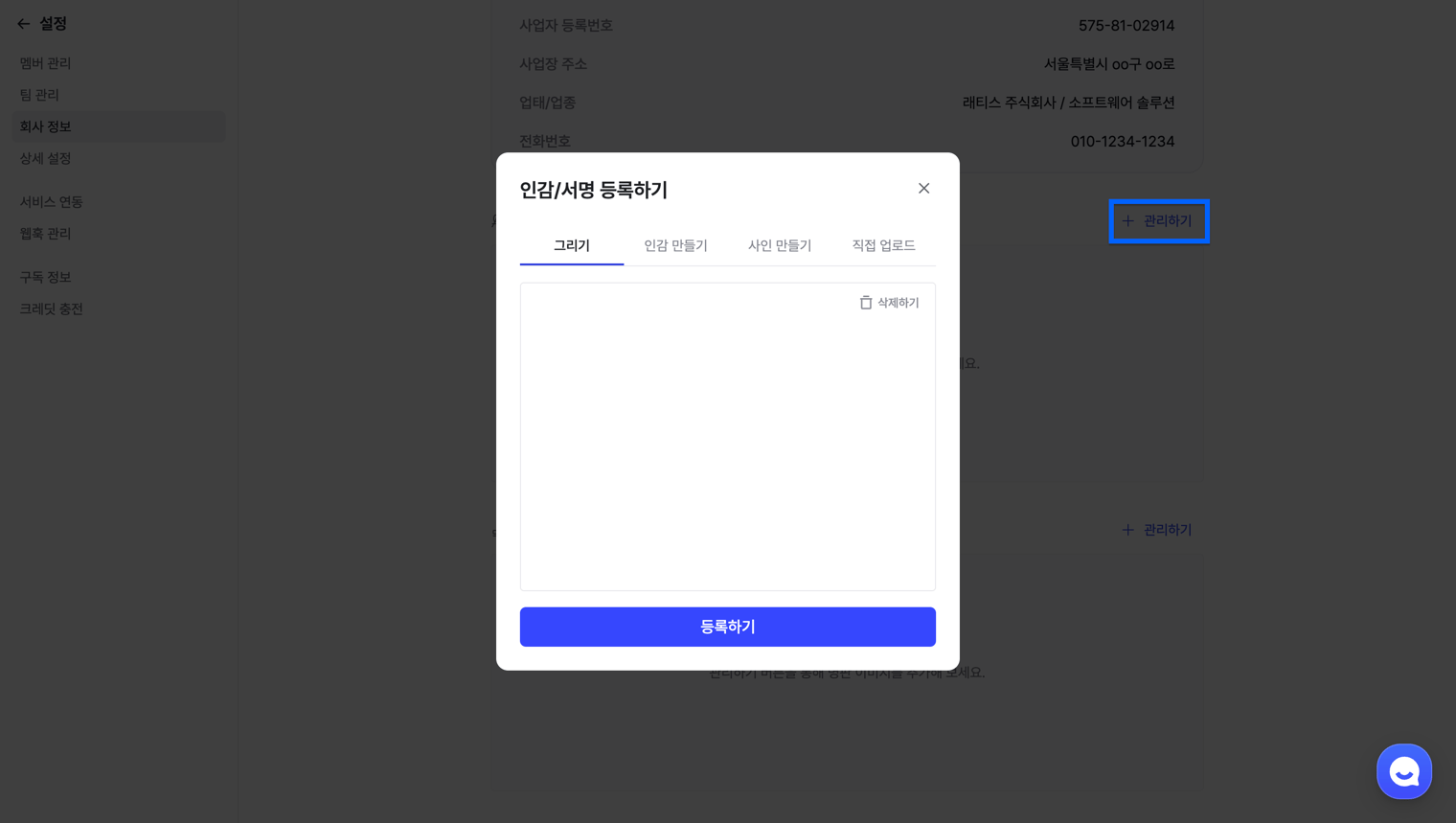 [설정] > [회사 정보] 탭 > [서명/인감 관리] > [관리하기] 버튼