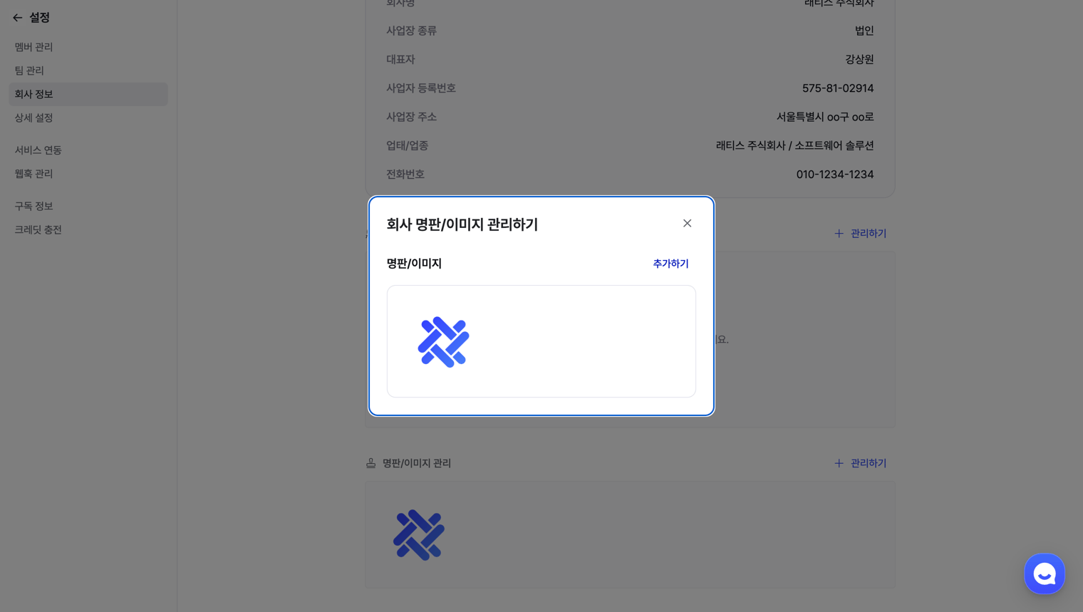 [설정] 메뉴 > [회사 정보] 탭 > [명판/이미지 관리] > [관리하기] 버튼