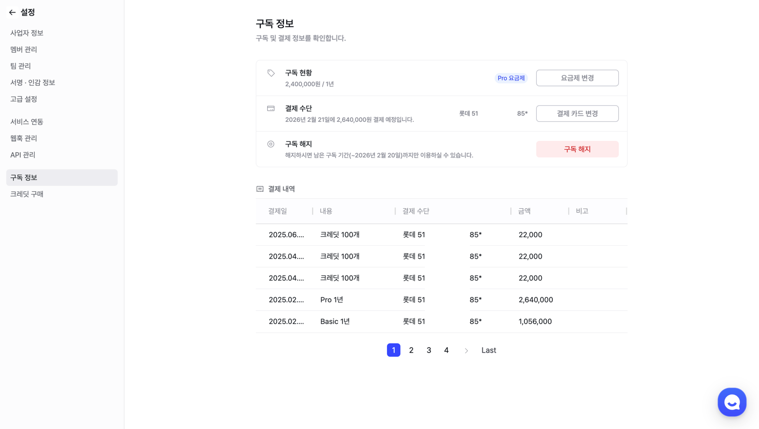 해당 페이지에서 요금제 및 결제 카드 변경, 구독해지, 결제 내역 확인이 모두 가능합니다.