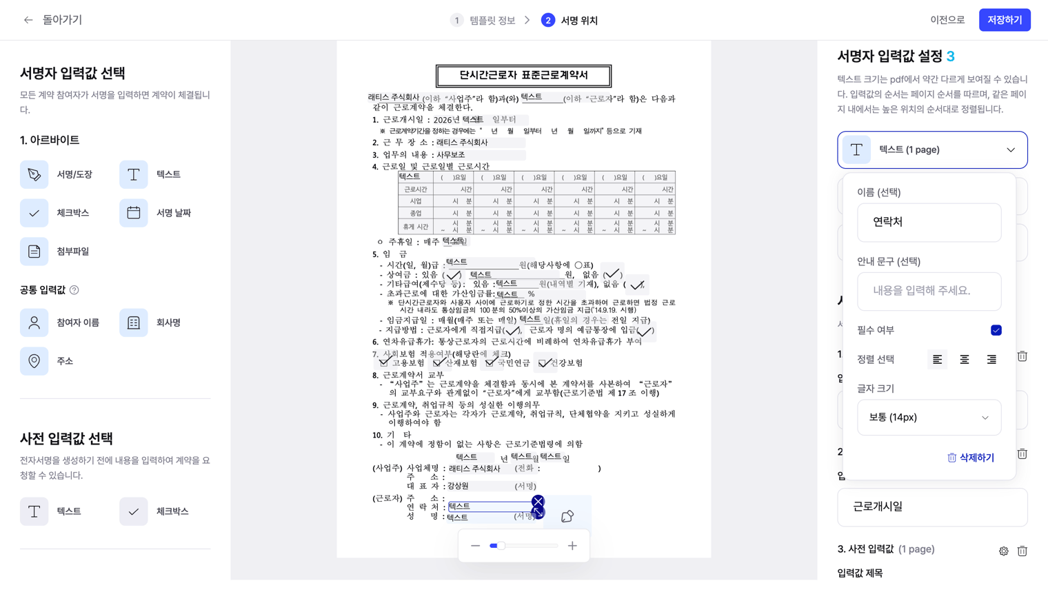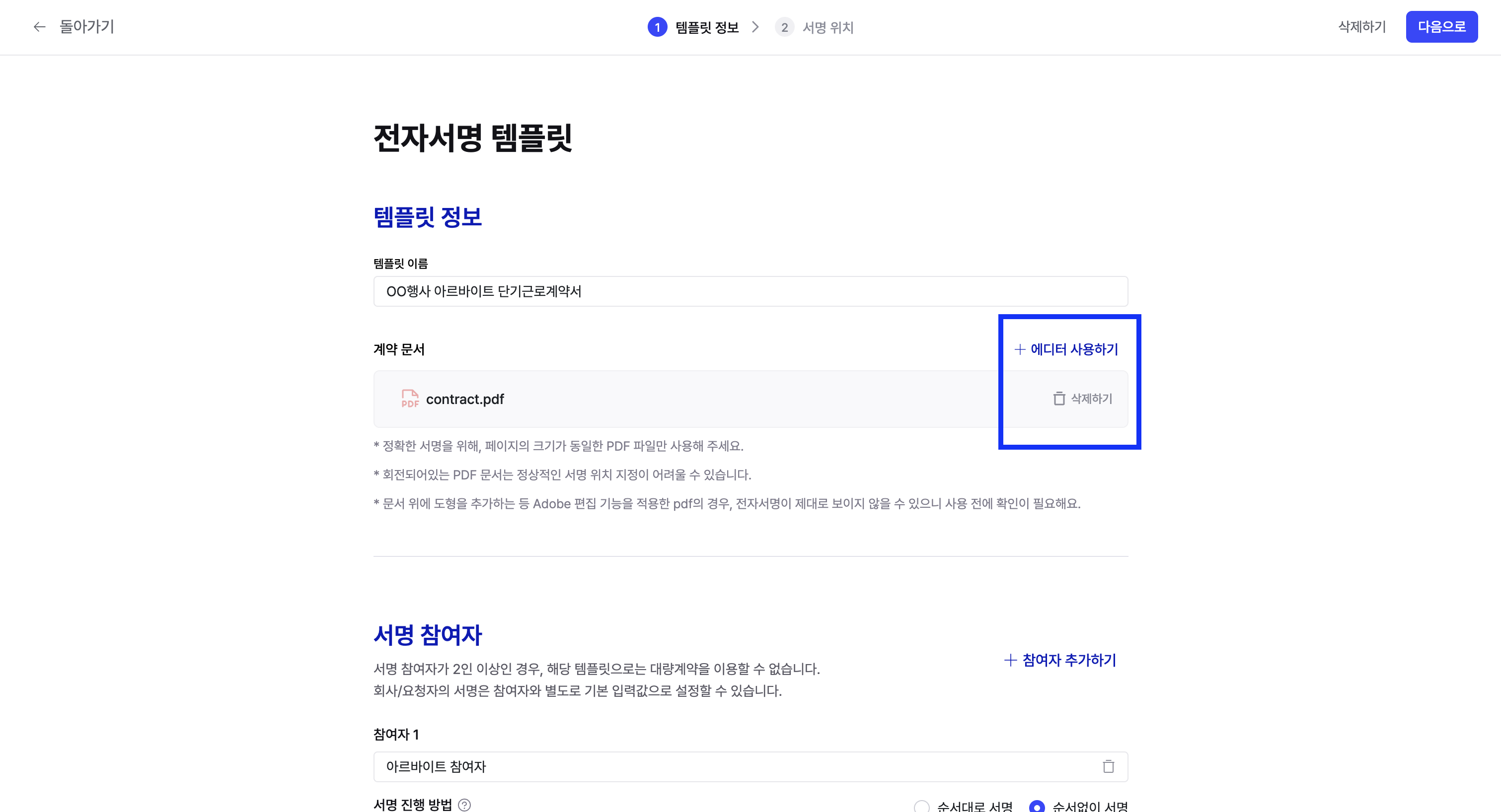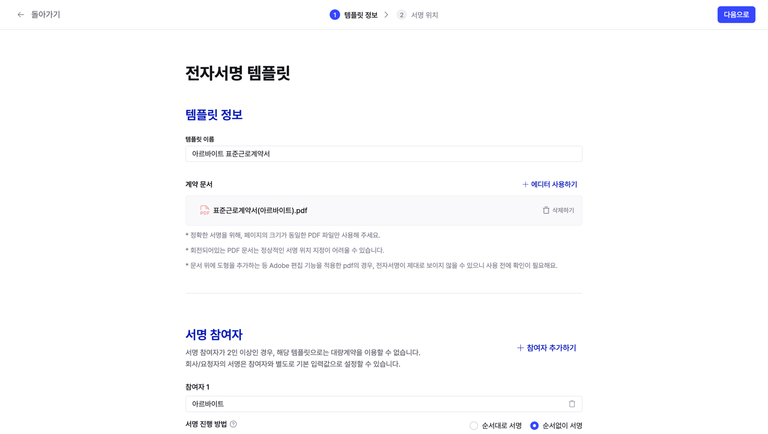 템플릿 정보를 입력한 후 [다음으로] 버튼을 눌러 서명 위치를 지정할 수 있습니다.
