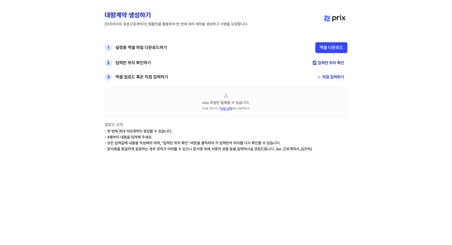 엑셀 업로드 혹은 직접 입력하는 방식으로 서명자 및 계약 정보를 작성할 수 있습니다.