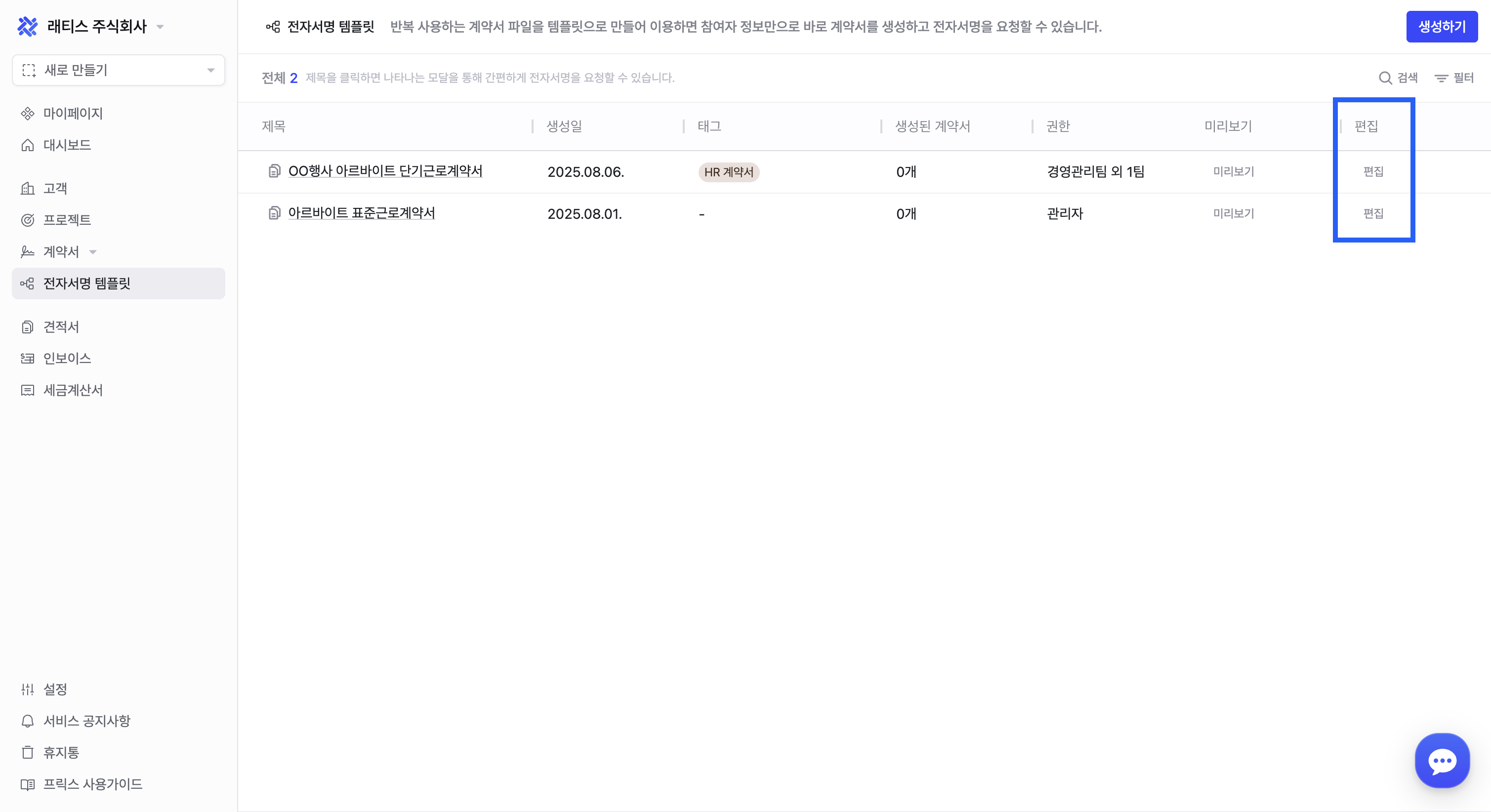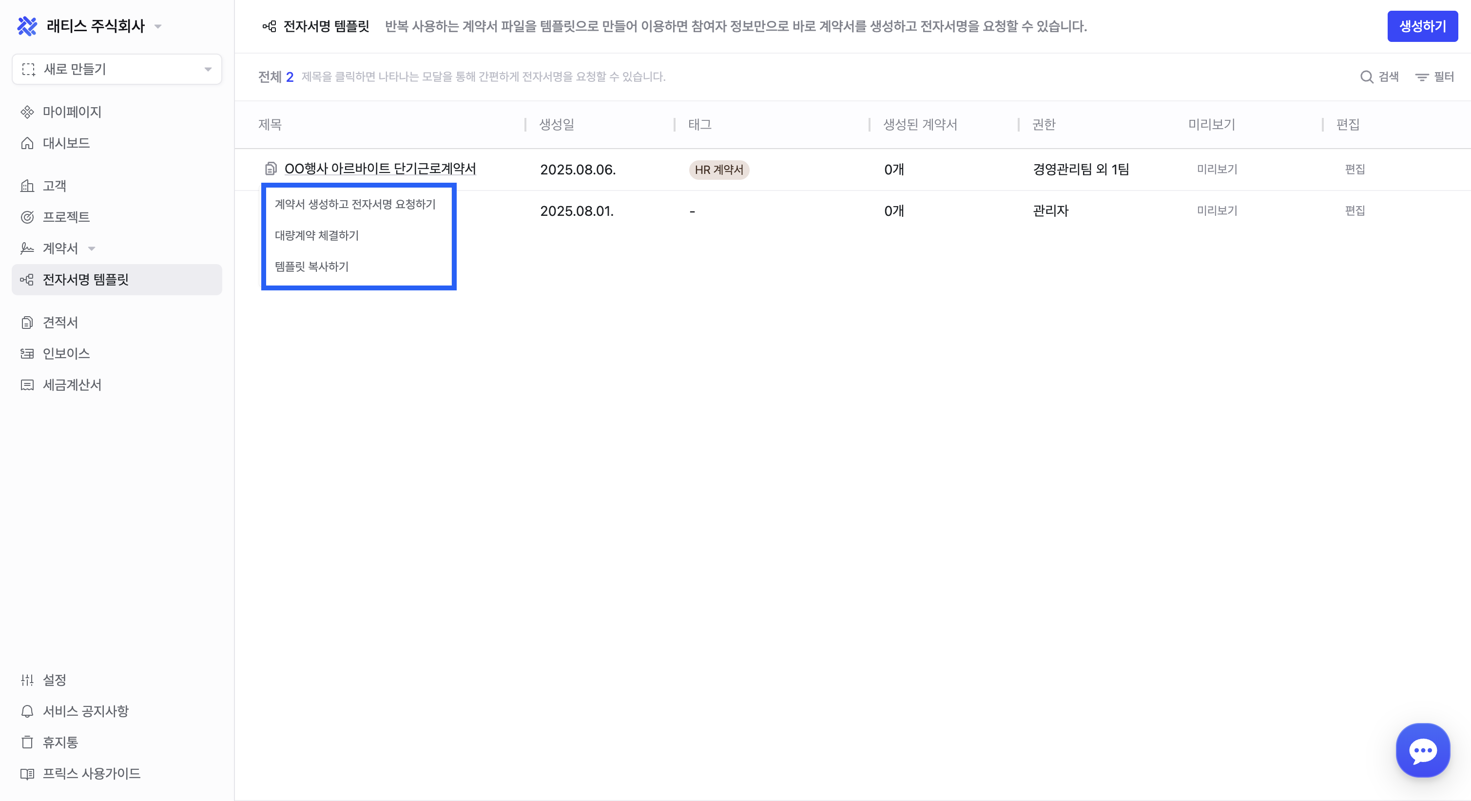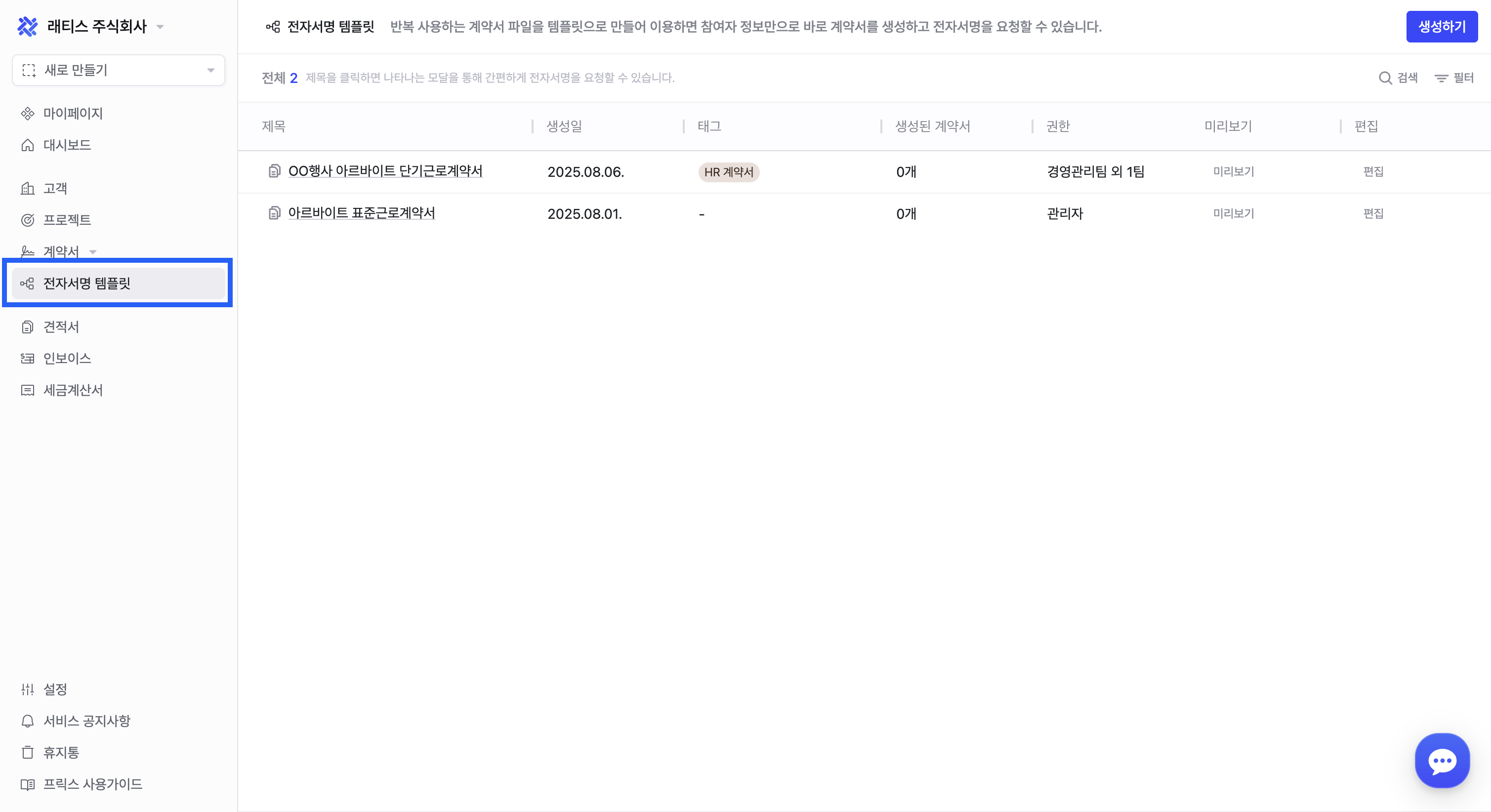 [전자서명 템플릿] 페이지 > 우측 상단 [생성하기] 버튼