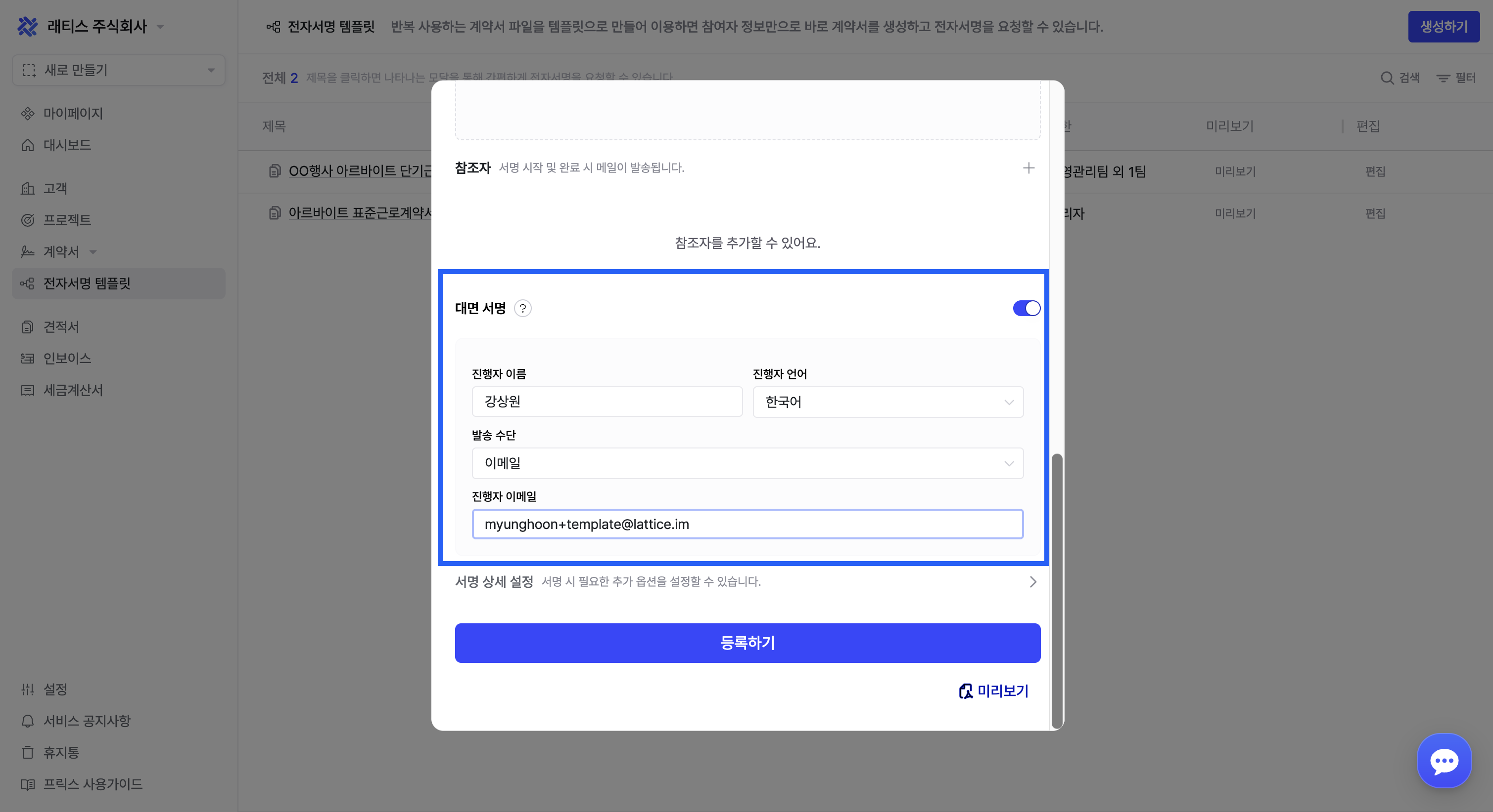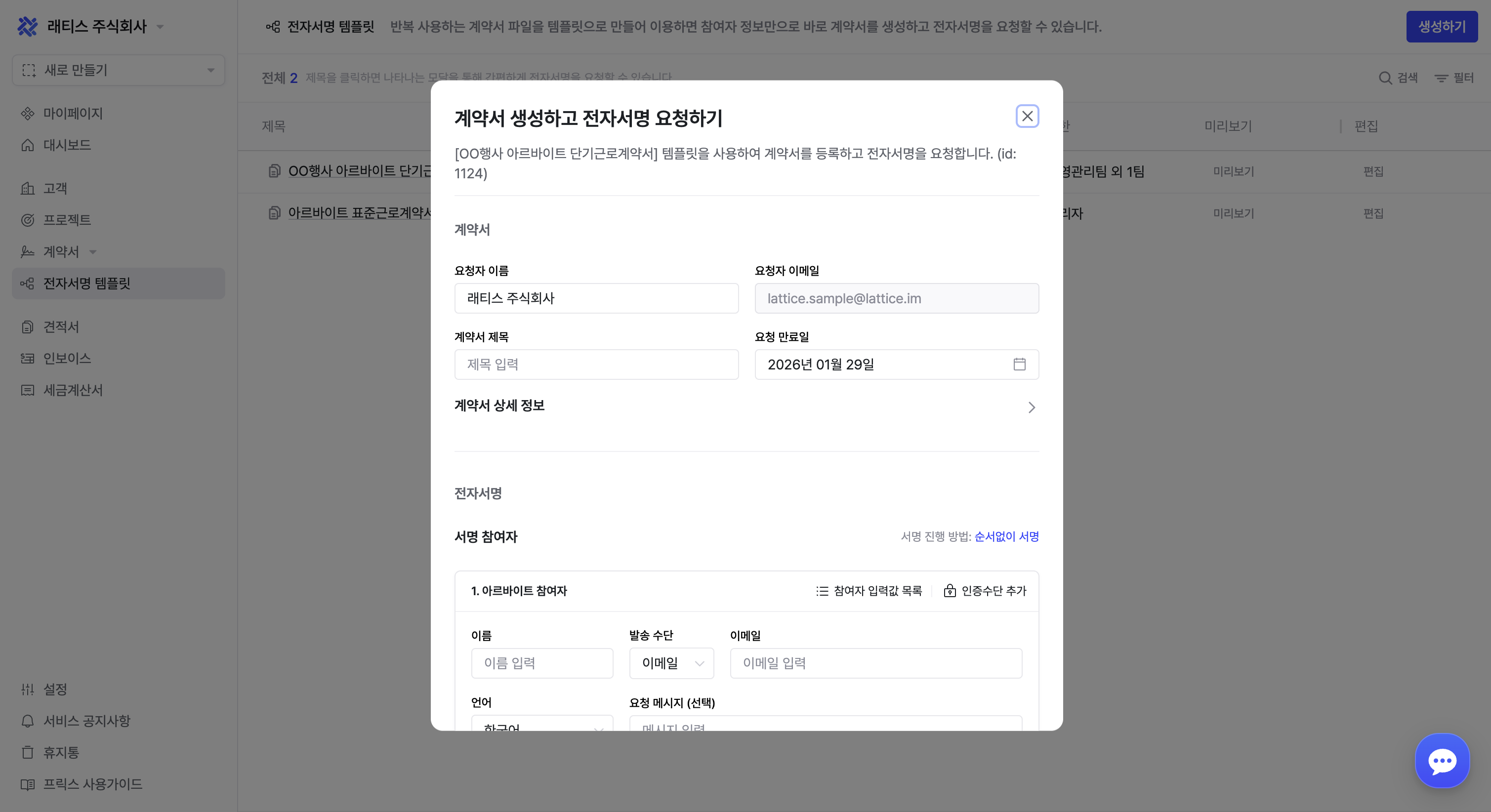 전자서명 요청 : 템플릿 이름 > [계약서 생성하고 전자서명 요청하기]