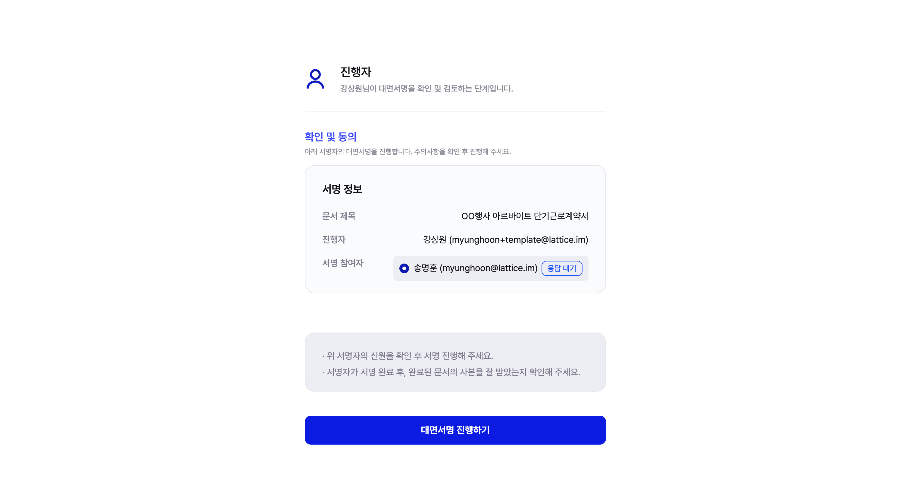 문서 제목, 서명 참여자, 진행자 정보 등 확인한 후 '대면서명 진행하기' 버튼 클릭한 이후 후속 단계를 진행해주세요. 이후 과정은 일반 전자서명 체결 과정과 동일합니다.