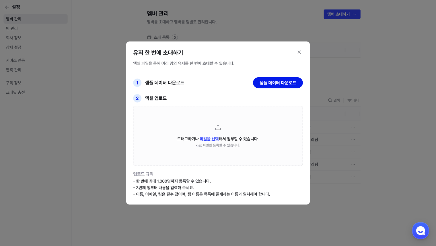 유저 한 번에 초대하기 창에서 [샘플 데이터 다운로드]를 클릭하면, 엑셀의 특정 열에 유저의 어떤 정보를 입력해야 하는지 확인할 수 있습니다.