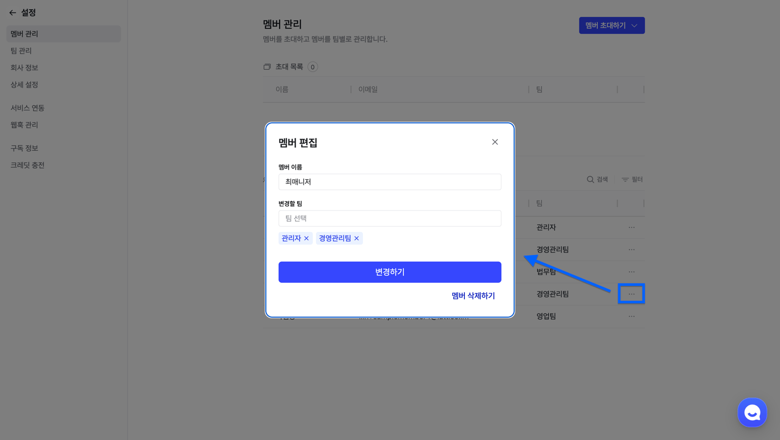 멤버 목록 우측의 각 팀별 [⋯] 아이콘 > [편집] 버튼을 눌러 멤버 설정을 변경할 수 있습니다.