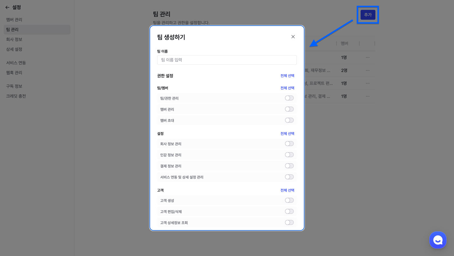 좌측 사이드바 [설정] 메뉴 > [팀 관리] 탭 > 우측 상단의 [추가] 버튼