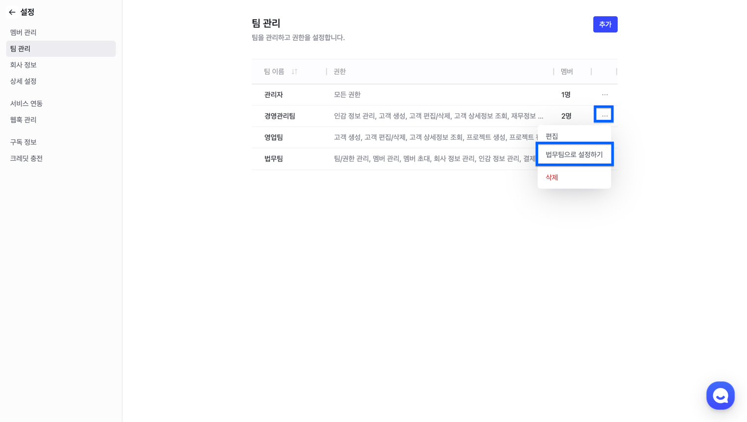 팀 관리 탭 > 팀 목록 우측의 각 팀별 [⋯] 아이콘 > [법무팀으로 설정하기] 버튼