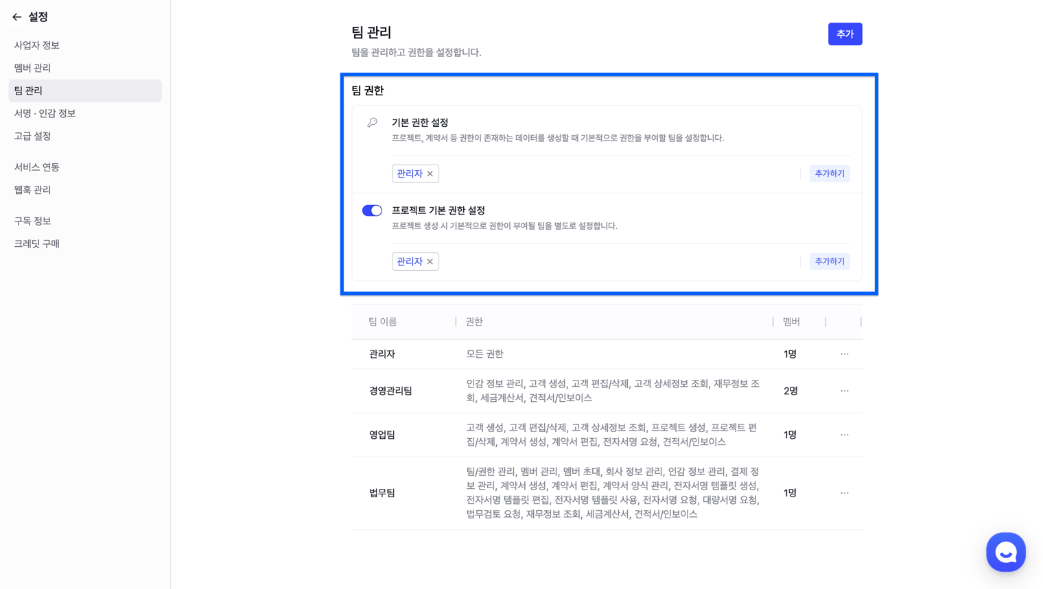 계약서, 프로젝트를 생성할 때 자동으로 적용되는 기본 권한(팀)을 별도로 지정할 수 있습니다.