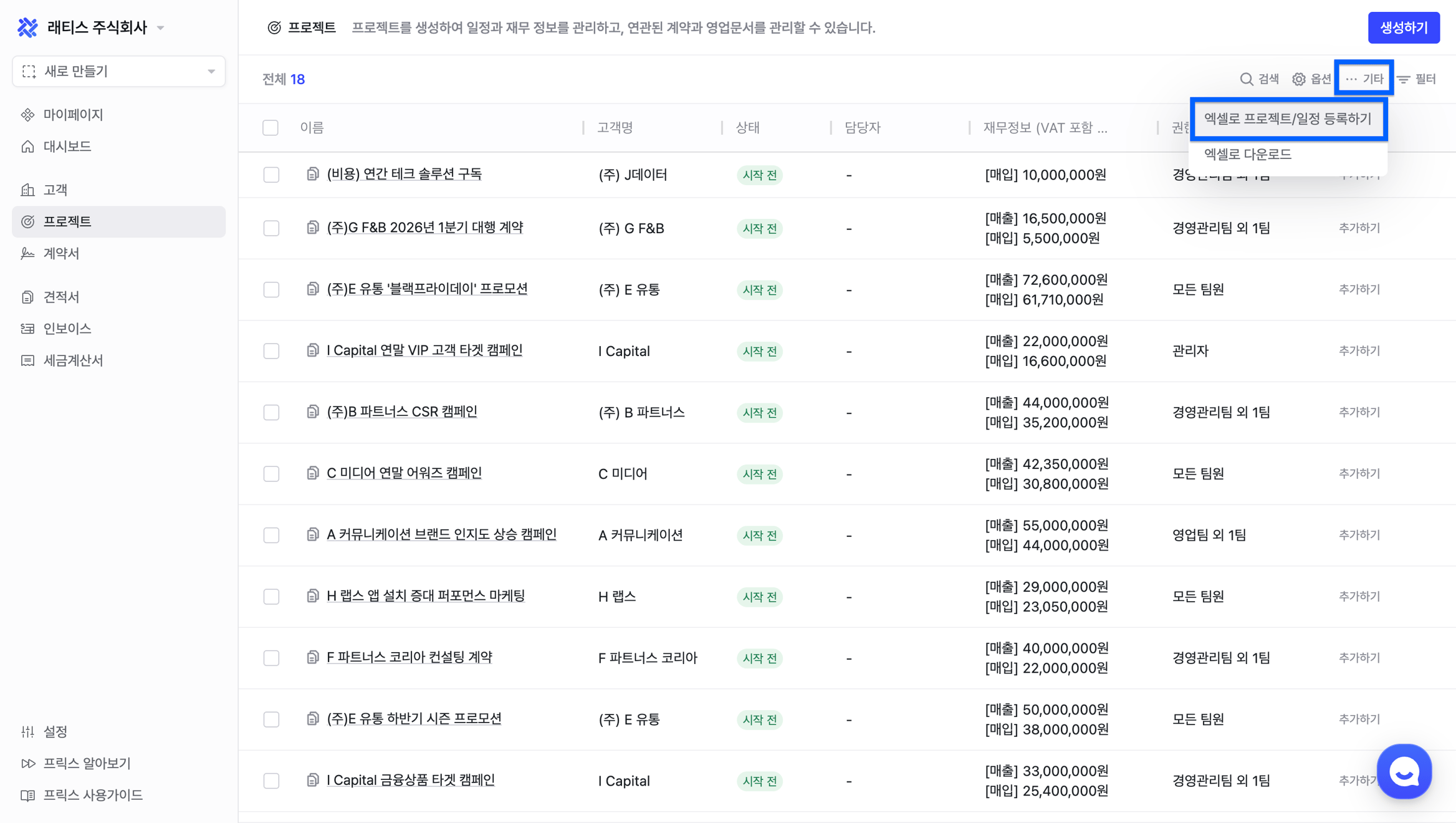 프로젝트와 연결된 견적서, 인보이스와 세금계산서를 한눈에 확인할 수 있습니다.