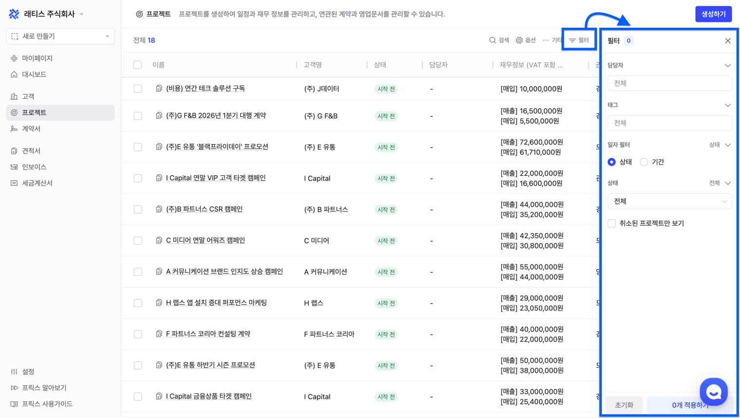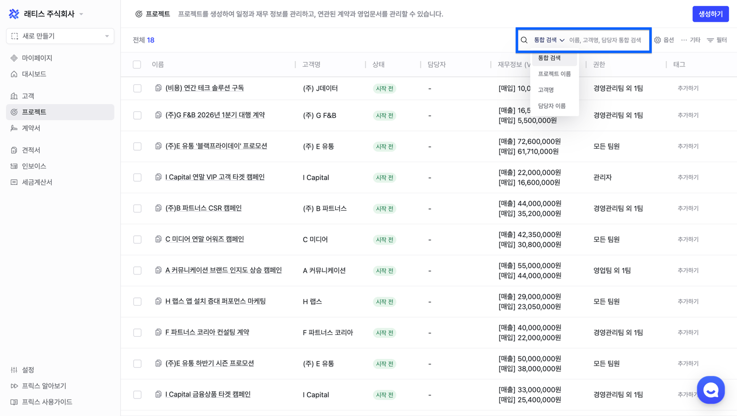 프로젝트 이름, 고객명, 담당자 등 원하는 키워드를 입력해 프로젝트를 빠르게 찾을 수 있습니다.