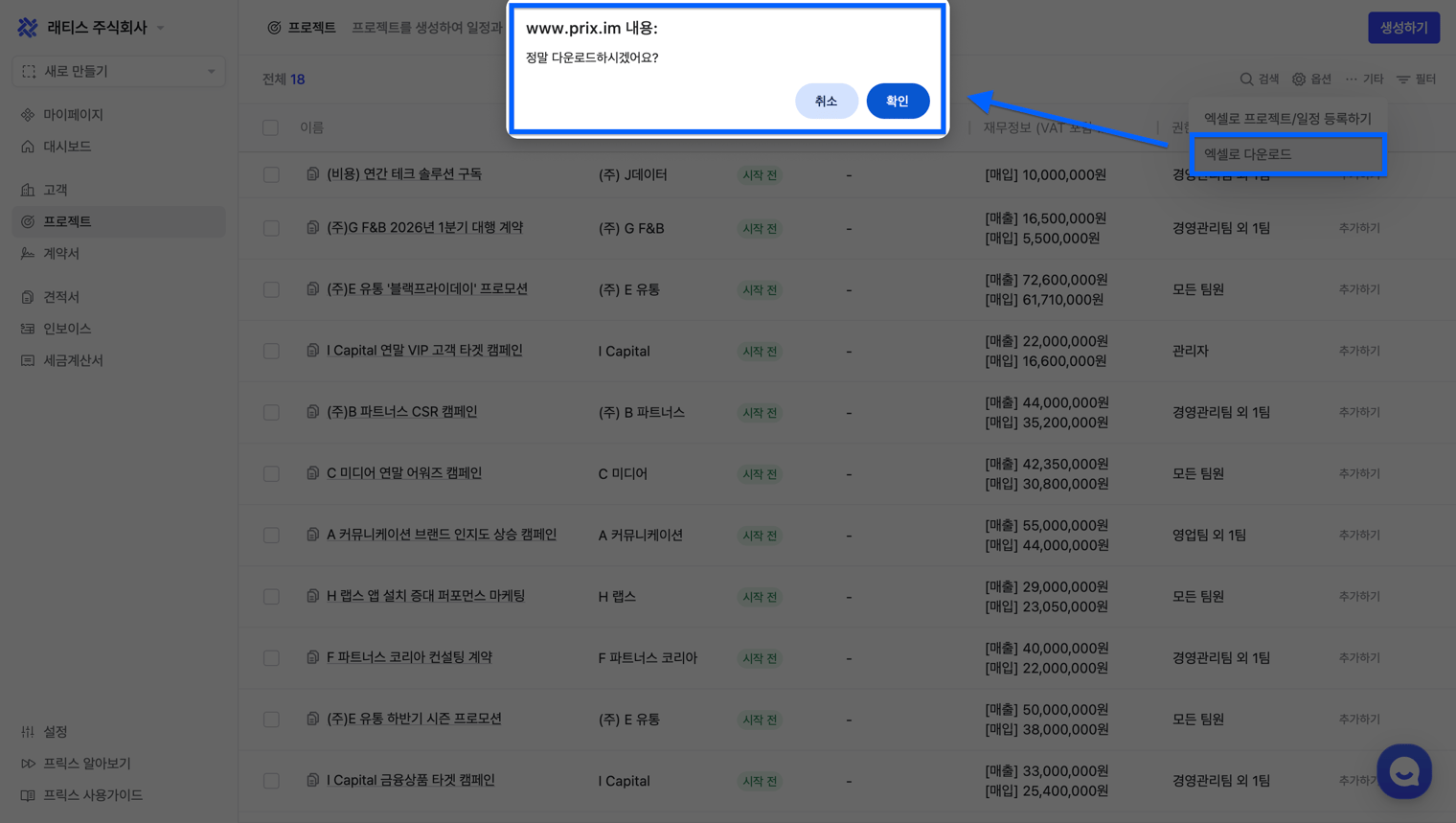 프로젝트 및 일정 정보가 포함된 프로젝트 목록을 다운로드할 수 있습니다.