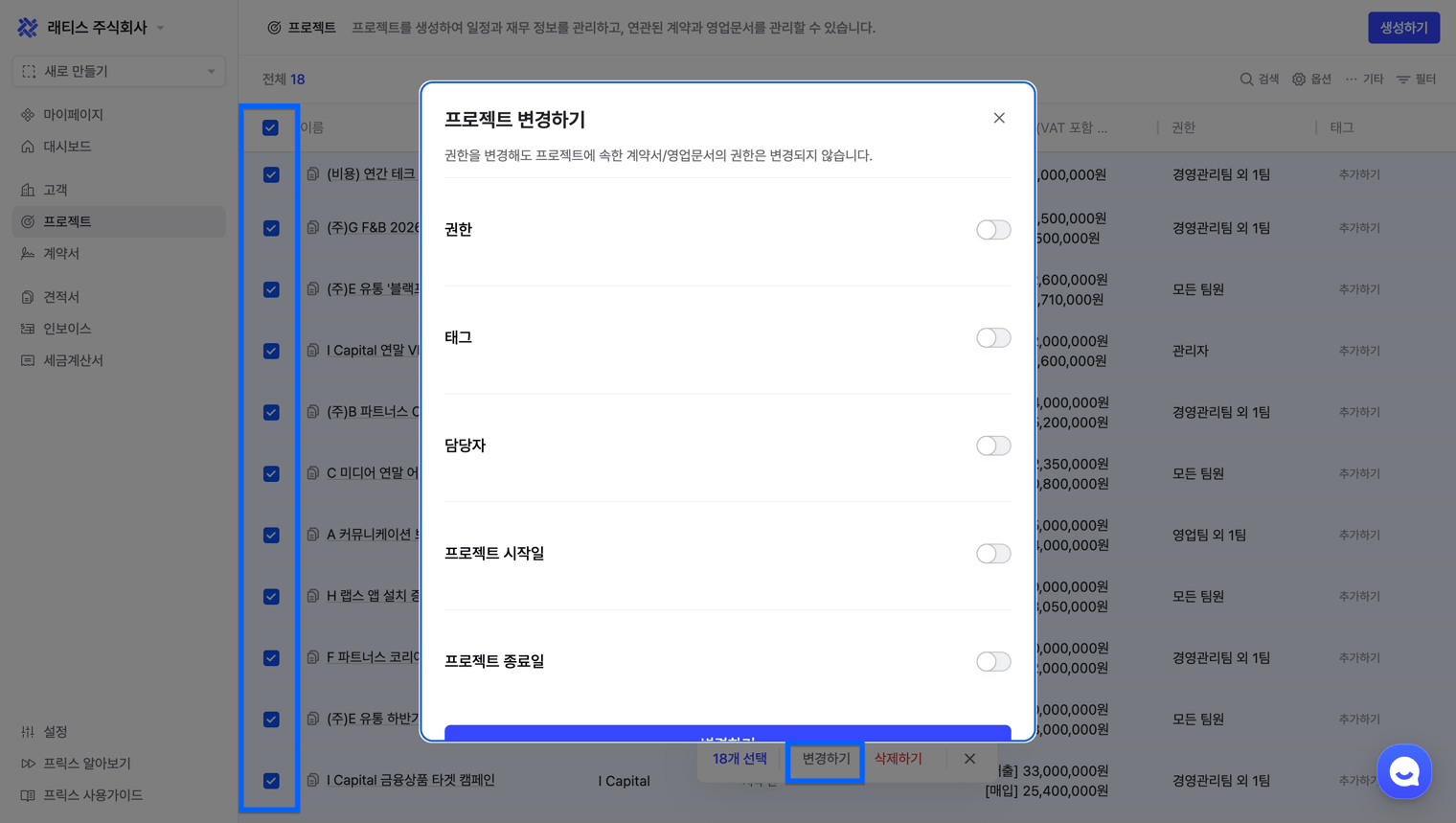 여러 프로젝트를 선택해서 권한, 태그, 담당자를 일괄적으로 변경할 수 있습니다.