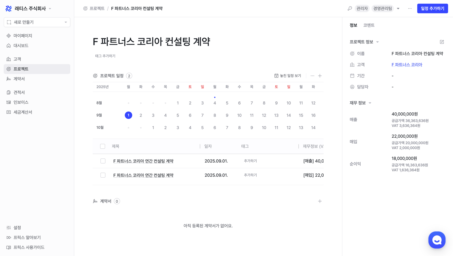 프로젝트와 연결된 계약서 목록을 확인할 수 있습니다.