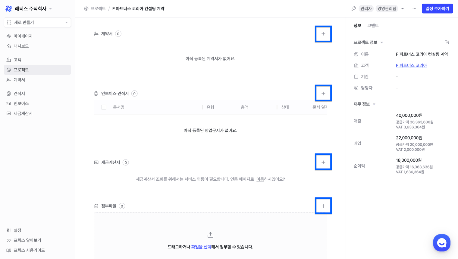 섹션 우측의 플러스 아이콘을 클릭하면 프로젝트와 연결된 신규 계약서를 생성할 수 있습니다.