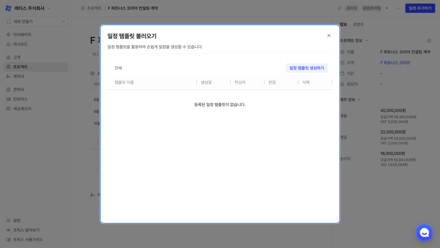 우측 상단 [일정 템플릿 생성하기] 버튼을 클릭해 일정을 추가합니다.