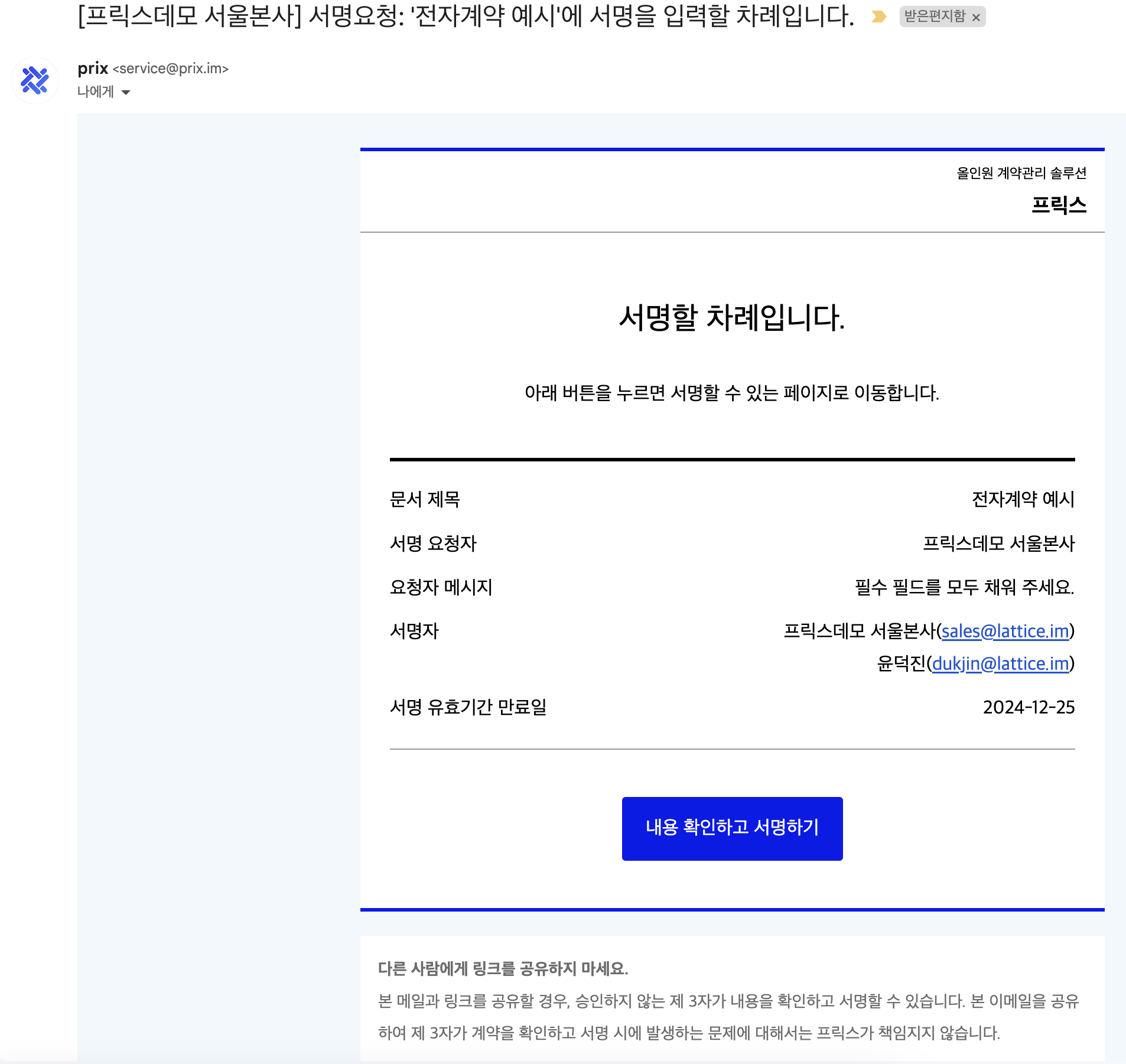 이메일로 서명 요청을 받으셨다면, 메일함에서 프릭스가 발송한 메일을 확인하실 수 있습니다.