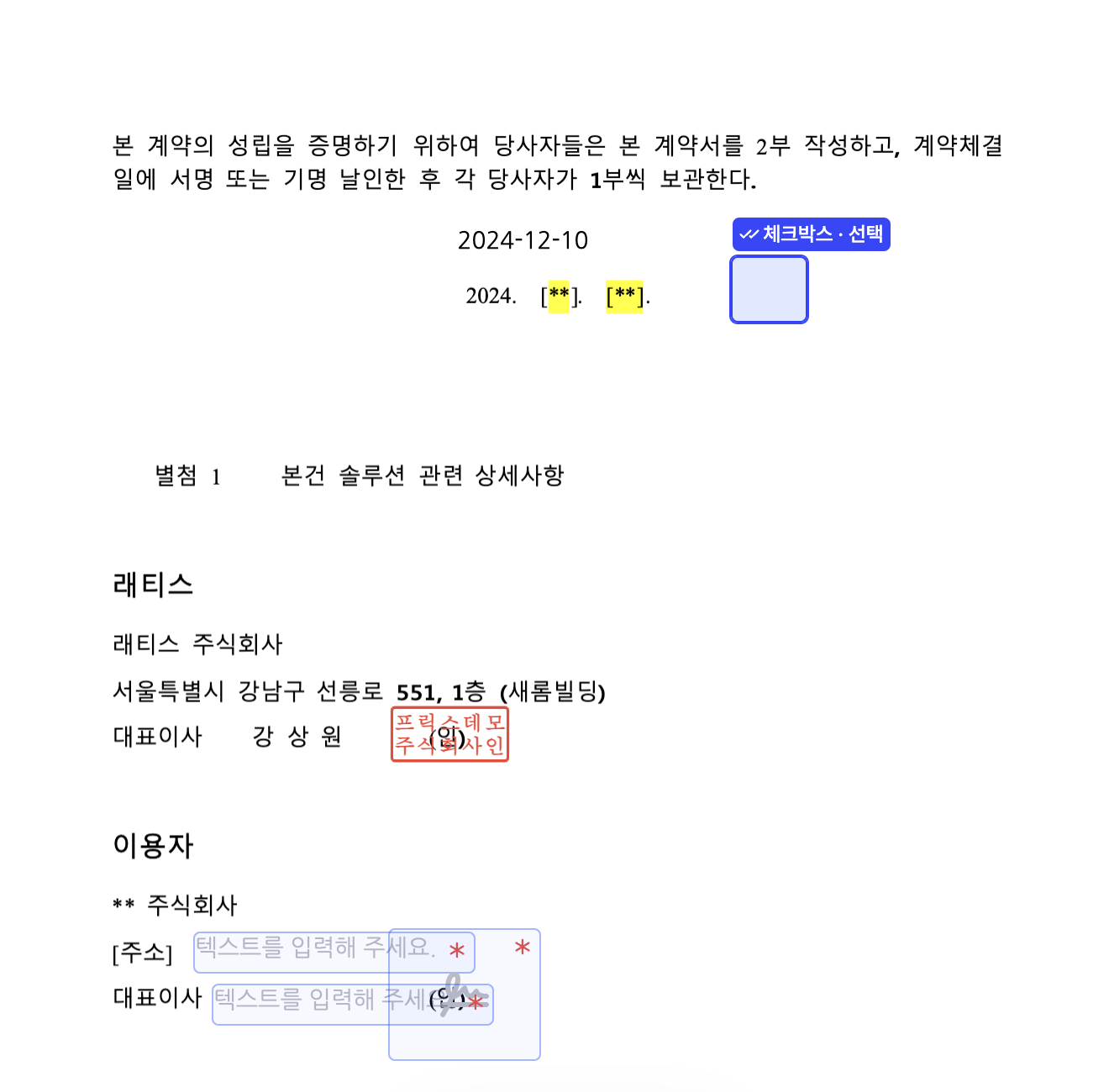 문서 내 체크박스가 있다면 해당하는 곳에 체크하고, 텍스트 입력란에 해당하는 내용을 입력합니다.