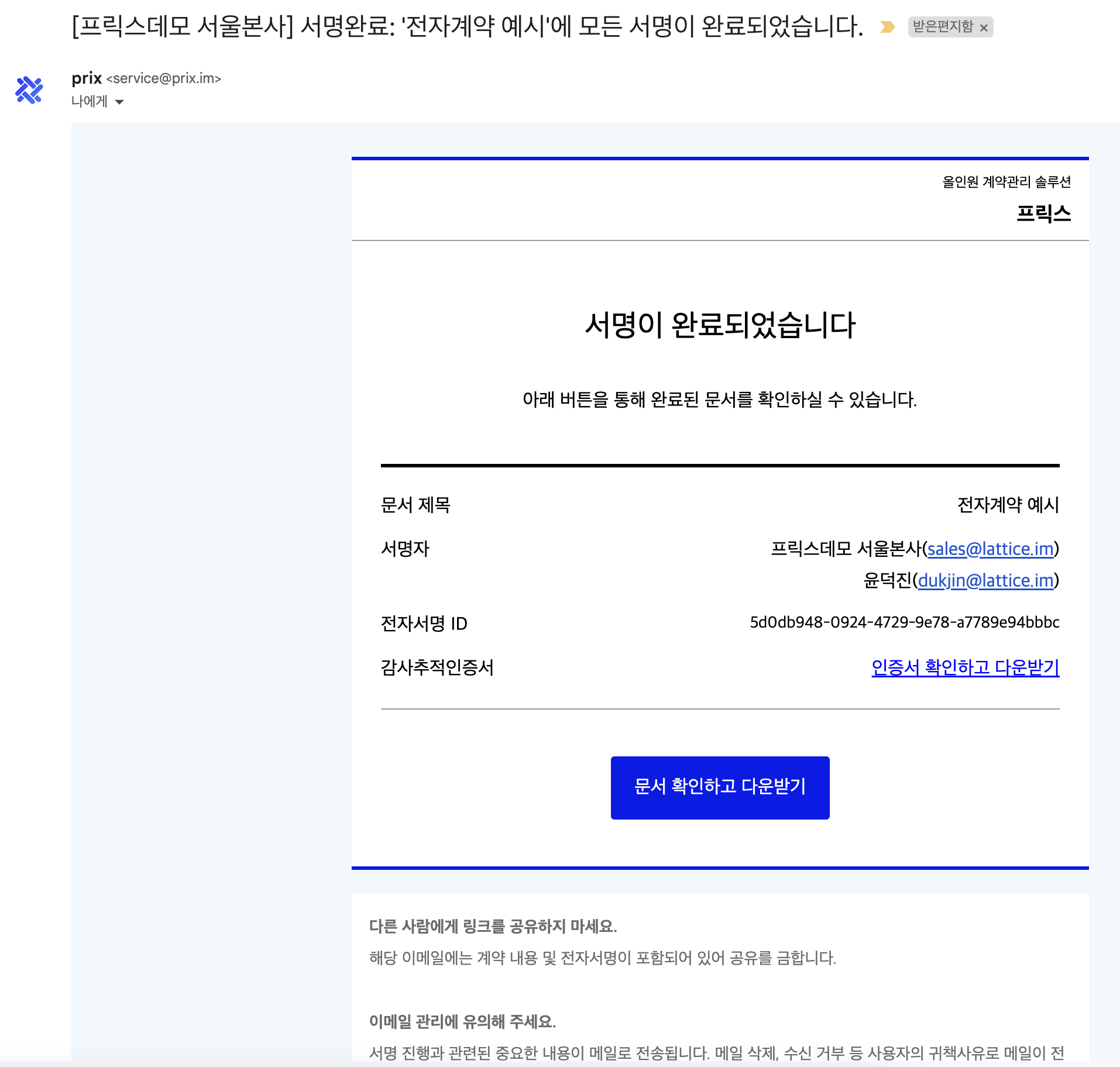 모든 서명 참여자가 서명을 마치면, 서명 참여자의 이메일로 체결이 완료된 계약문서와 감사추적인증서가 발송됩니다.