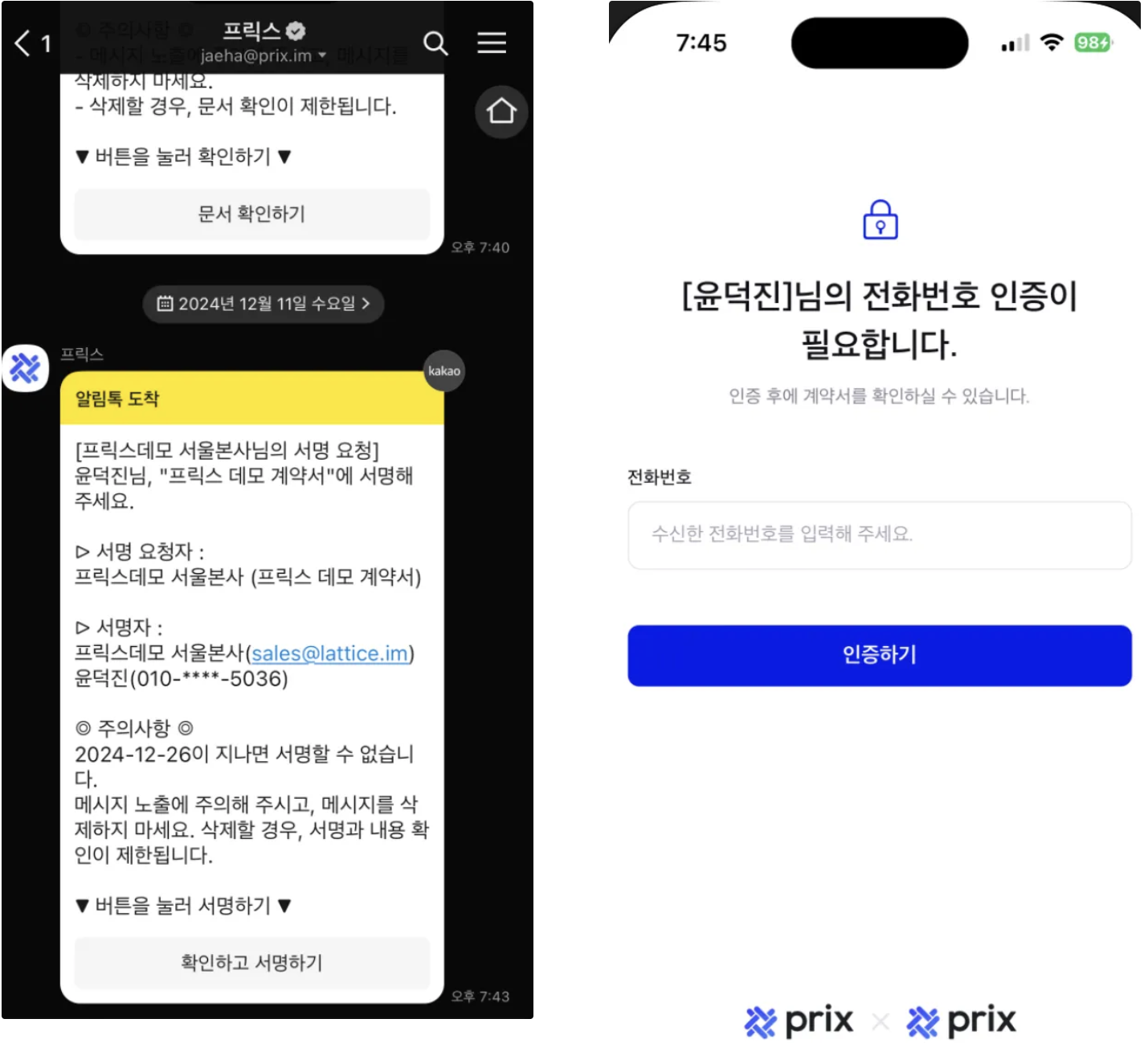 프릭스는 이메일 혹은 모바일(카카오톡, 카카오톡 수신이 불가능할 경우 문자 메시지)로 서명할 수 있습니다.