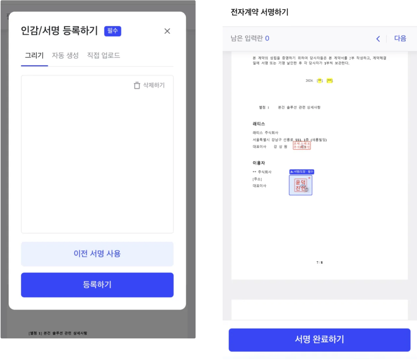 서명란을 클릭하면, 1. 손가락으로 그려서 서명하는 방식, 2. 텍스트로 회사명을 입력해 인감을 자동 생성하는 방식, 3. 인감 이미지를 업로드하는 방식을 모두 사용할 수 있습니다.