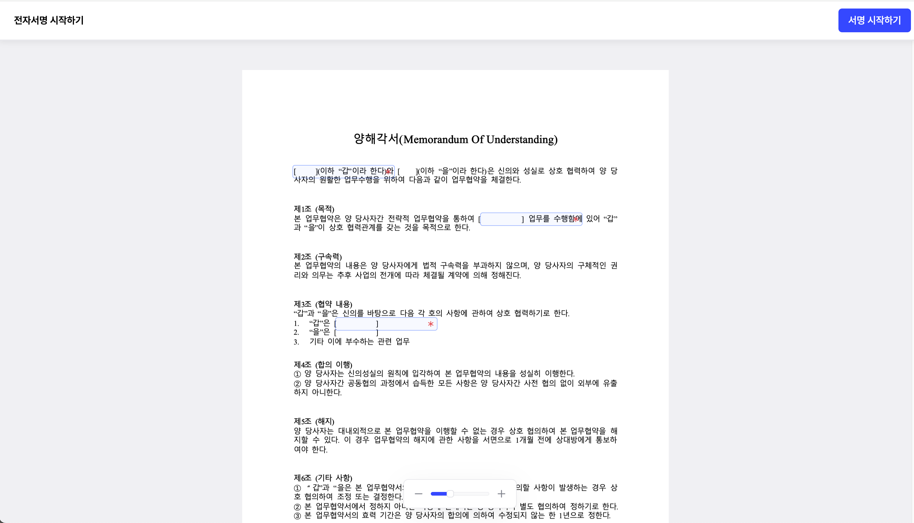 계약서 본문을 확인한 후, 우측 상단 [서명 시작하기] 버튼을 눌러 서명을 시작해주세요.