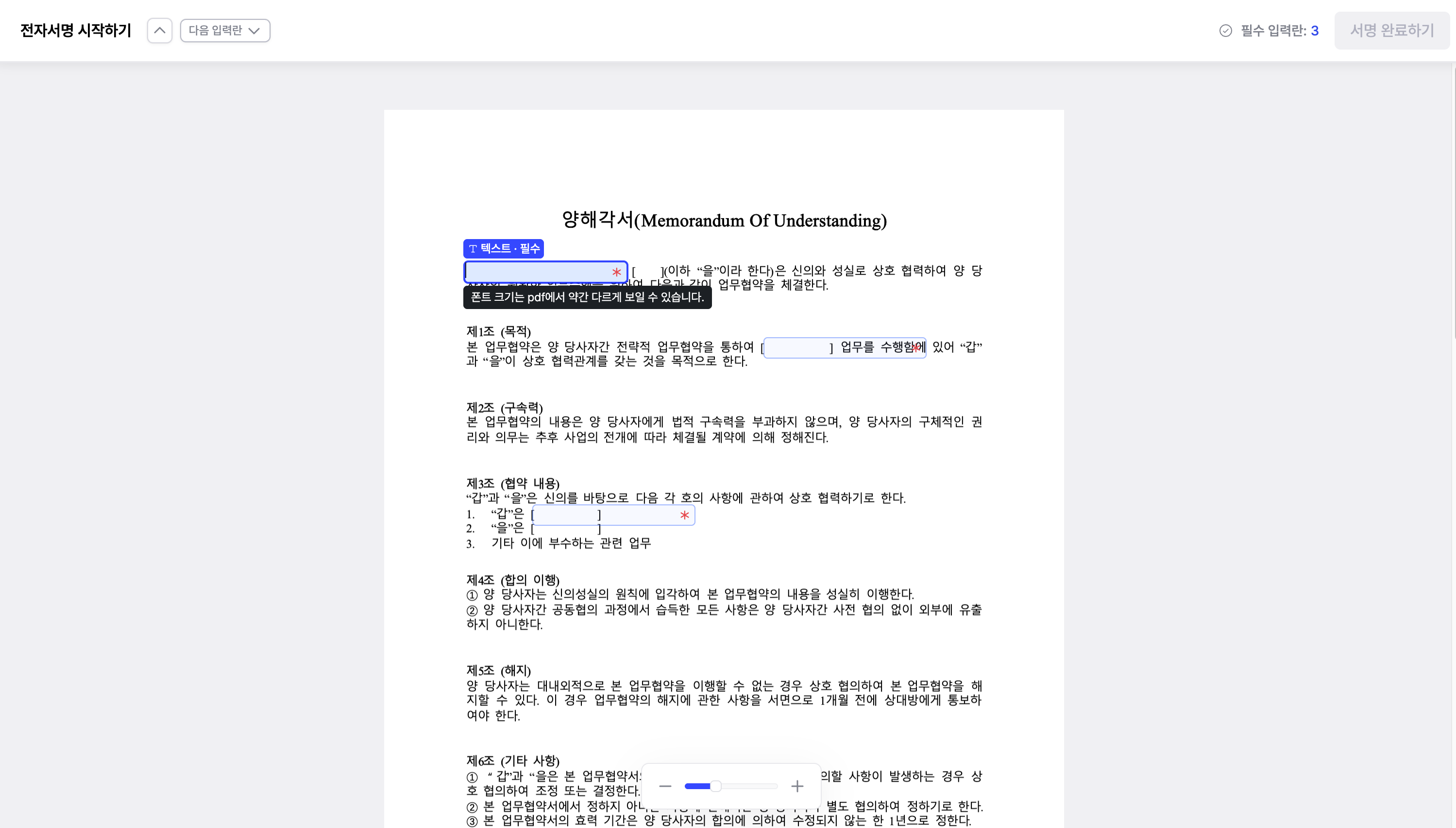 서명을 시작하면 입력이 필요한 입력란으로 바로 이동합니다.