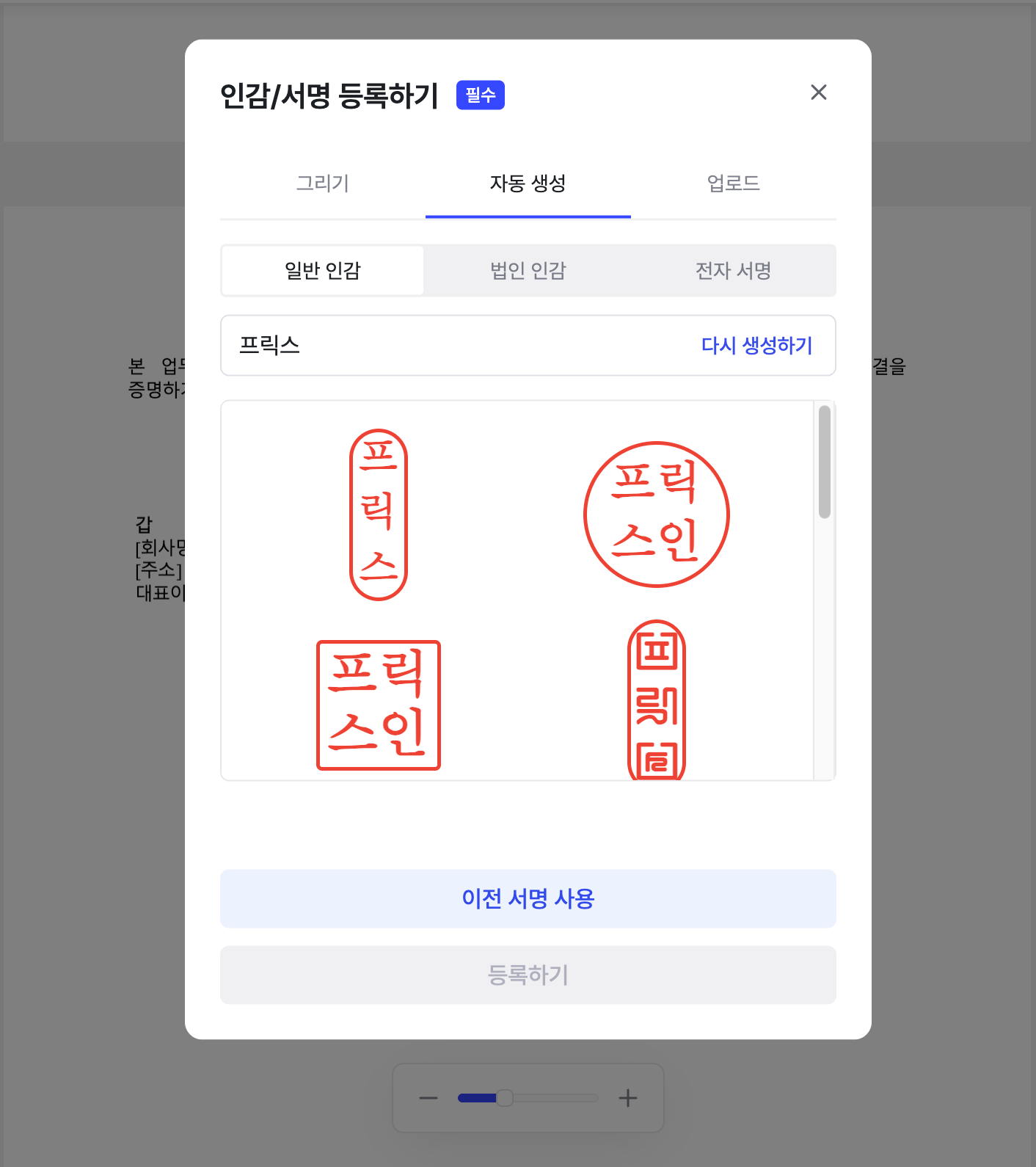 '자동 생성' 옵션에서는 텍스트를 입력해 일반 인감, 법인 인감, 서명을 생성할 수 있습니다.