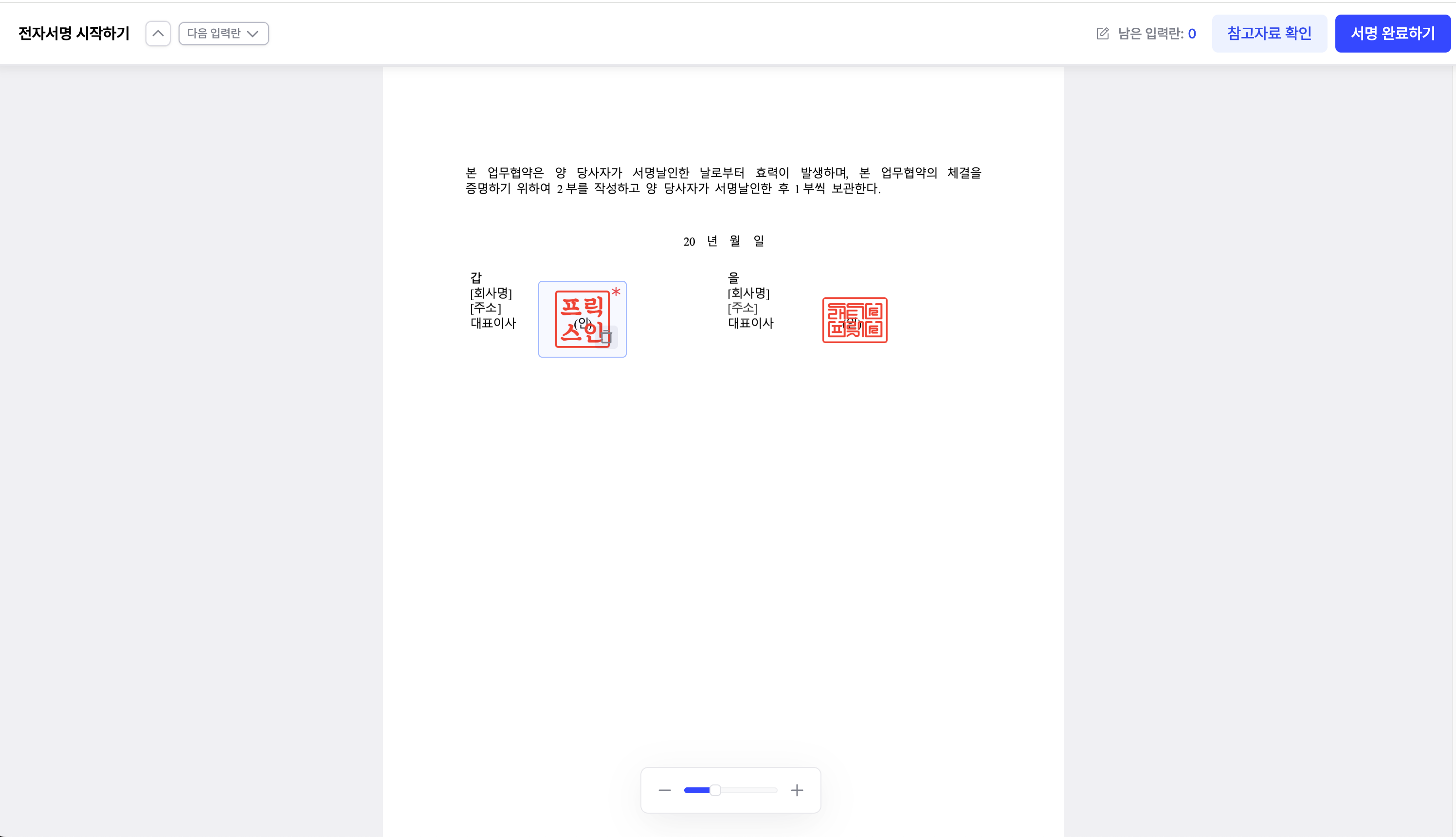 필수값을 모두 입력하면, 우측 상단의 [서명 완료하기] 버튼을 클릭하여 서명을 완료할 수 있습니다.