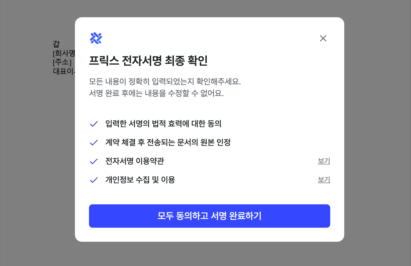 '서명 완료 전 최종 확인' 창에서 [모두 동의하고 서명 완료하기] 버튼 클릭 시, 서명이 완료됩니다.