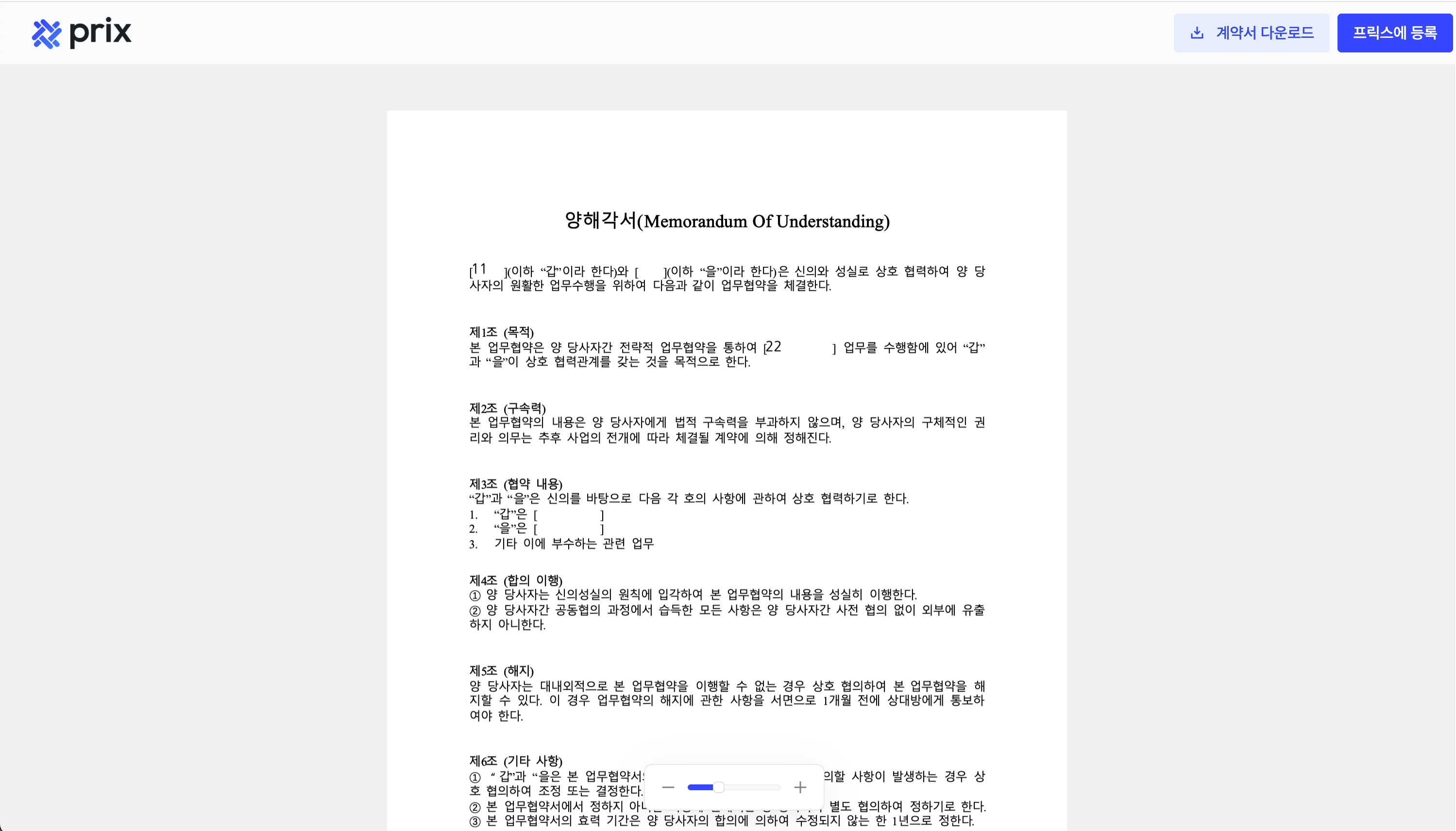 복사하는 법: 맨 위의 '프릭스 | 계약관리 솔루션'을 클릭하면 인터넷 주소가 나옵니다. 전체를 드래그해서 복사하신 다음, 타 브라우저에 들어가 맨 위의 텍스트 입력란을 모두 지운 뒤 길게 터치해서 [붙여넣기]를 누르시면 됩니다.