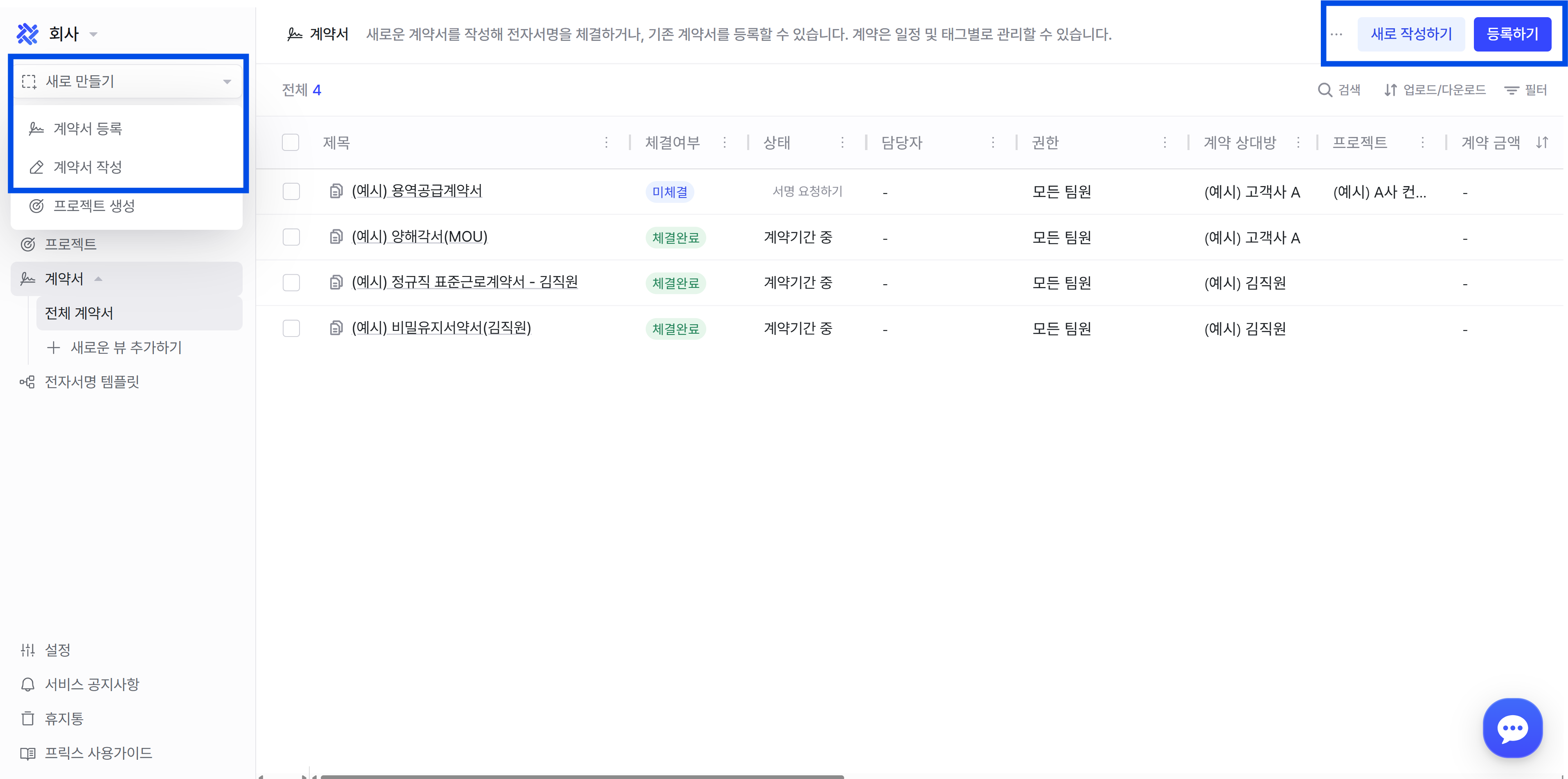 계약서는 좌측 상단 '새로 만들기' 내의 '계약서 등록'/'계약서 작성' 혹은 계약서 탭 내의 '새로 작성하기'/'등록하기' 버튼을 이용해 빠르게 등록할 수 있습니다.