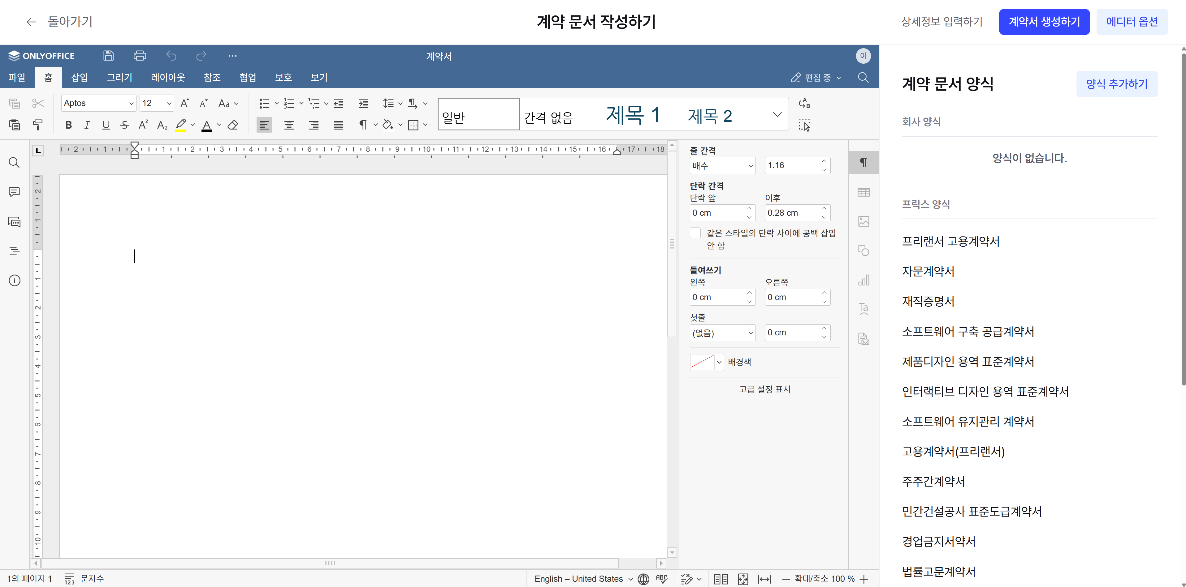메뉴 좌측 상단의 '계약서 작성' 버튼 혹은 계약서 탭 내의 '새로 작성하기' 버튼을 누르면 계약서를 처음부터 작성할 수 있는 에디터가 생성됩니다.