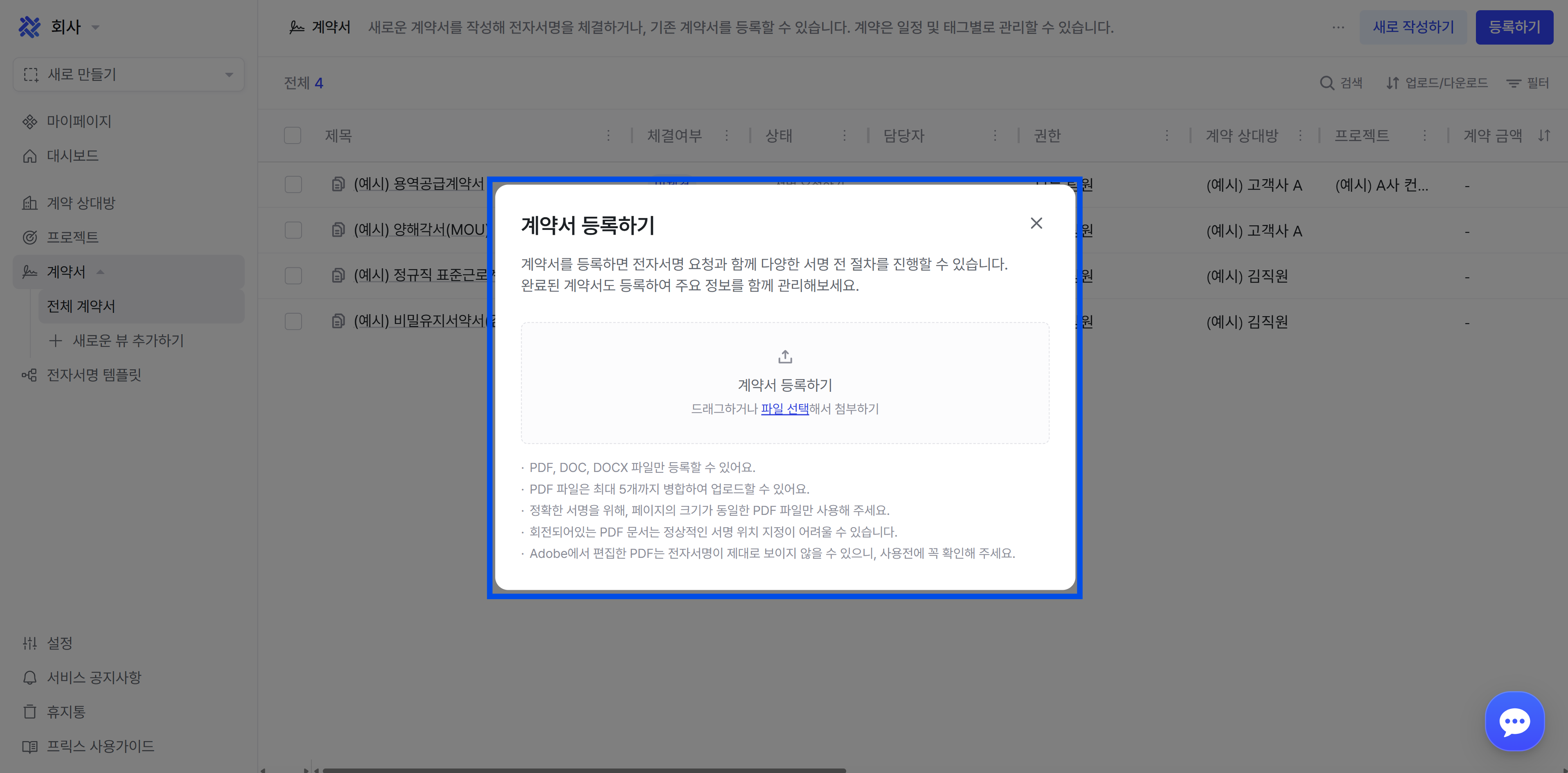 메뉴 좌측 상단의 '계약서 등록' 버튼 혹은 계약서 탭 내의 '등록하기' 버튼으로 PDF, DOC, DOCX 확장자의 계약서를 등록할 수 있습니다. (이 외 파일은 PDF로 인쇄하여 등록)